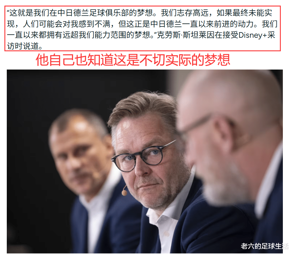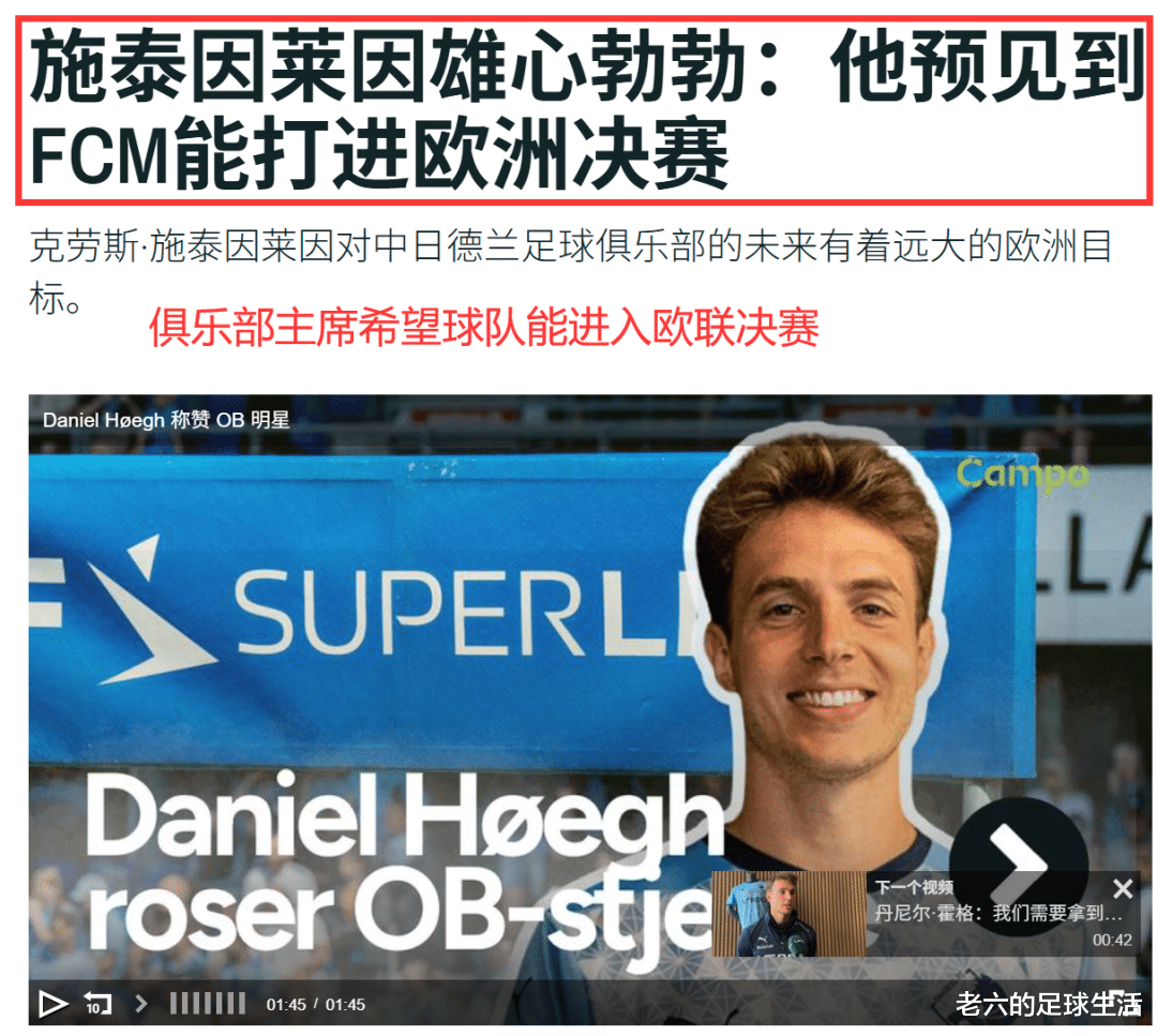 中日德兰这边俱乐部的主席克劳斯·施泰因莱因赛前可谓是雄心勃勃,他预想着球队能站在明年5月20日在伊斯坦布尔举行的欧联决赛舞台上。