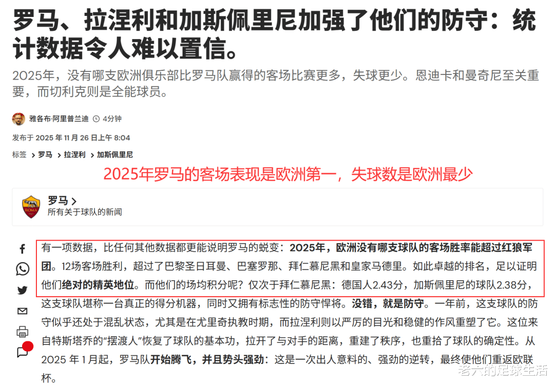 2025年没有哪支欧洲俱乐部比罗马的客场表现要更好,他们甚至超越了大巴黎、巴萨、拜仁等一众强队,球队的场均积分仅次于拜仁,堪称一台真正的得分机器。