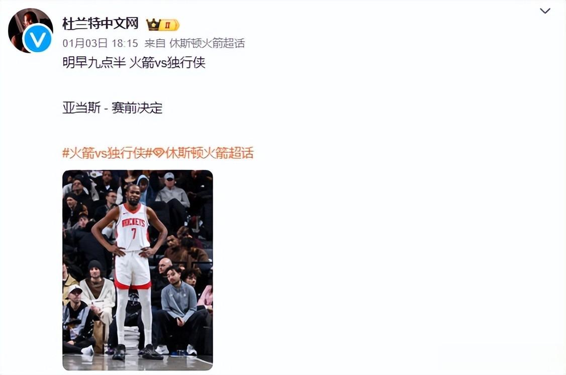 参考链接央视网(浓眉26+12+5杜兰特34分 独行侠主场力克火箭 2026.01.04)