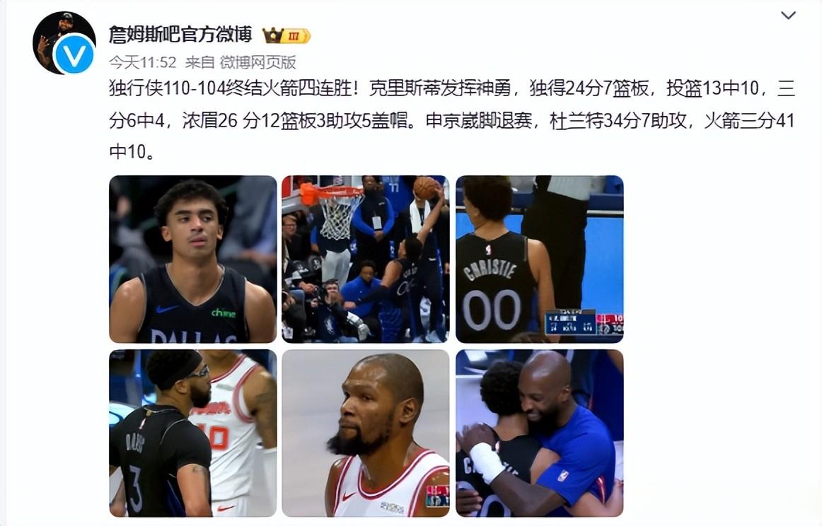 最终独行侠以110-104险胜火箭,终结了自己的四连败。
