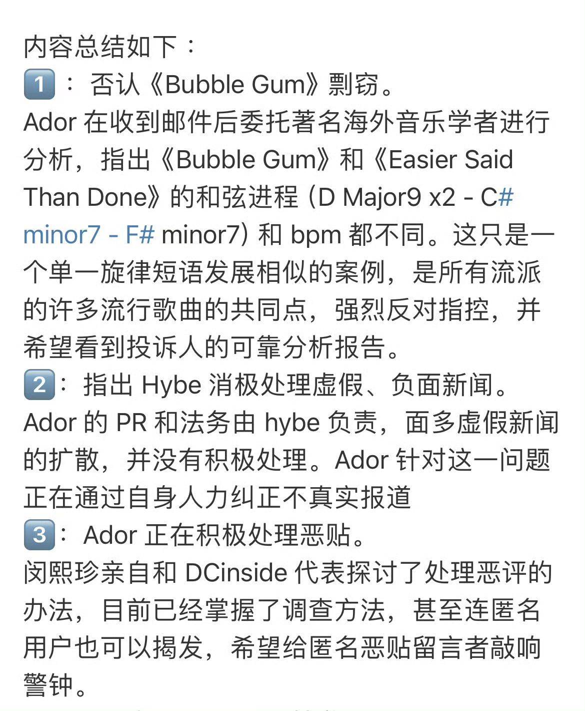 7月23日,Ador发布立场长文,对这段时间 NewJeans 争议和公司内部问题做出了回应。首先否认了歌曲《Bubble Gum》的剽窃争议。其次指出Hybe对于虚假、负面新闻的处理态度消极导致偏颇新闻层出不穷。最后称Ador努力纠正虚假内容和处理恶帖,积极探索保护NewJeans的所有方法。