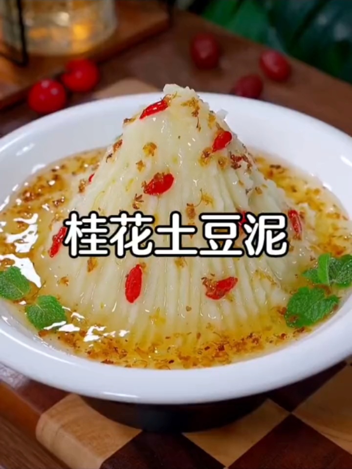 先把去皮的土豆切成薄片,然后起锅烧水,等待锅中水开放上锅蒸十分钟,取出来之后倒入一瓶牛奶再把它捣成土豆泥并整一个好看的造型,比如小动物或者大山。接着,放入枸杞和香菜点缀,再淋入桂花蜜,或者蜂蜜,这道美食就制作好了。制作方法是不是非常简单?这道美食大多数人都会喜欢,尤其是孩子,毕竟孩子多数都喜欢吃甜品。