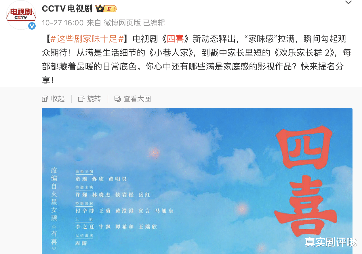在推荐语中,央妈也表达出了对《四喜》这部剧的高期待,直接将它与《小巷人家》对标,“电视剧《四喜》新动态释出,‘家味感’拉满,瞬间勾起观众期待。”