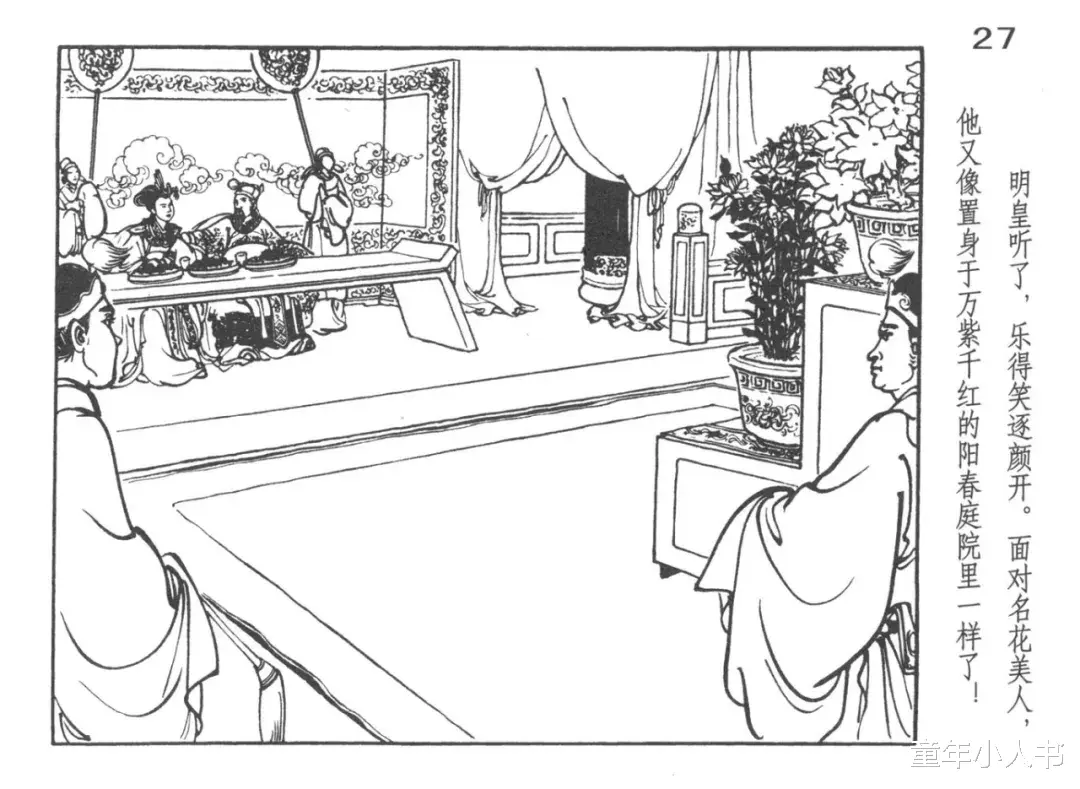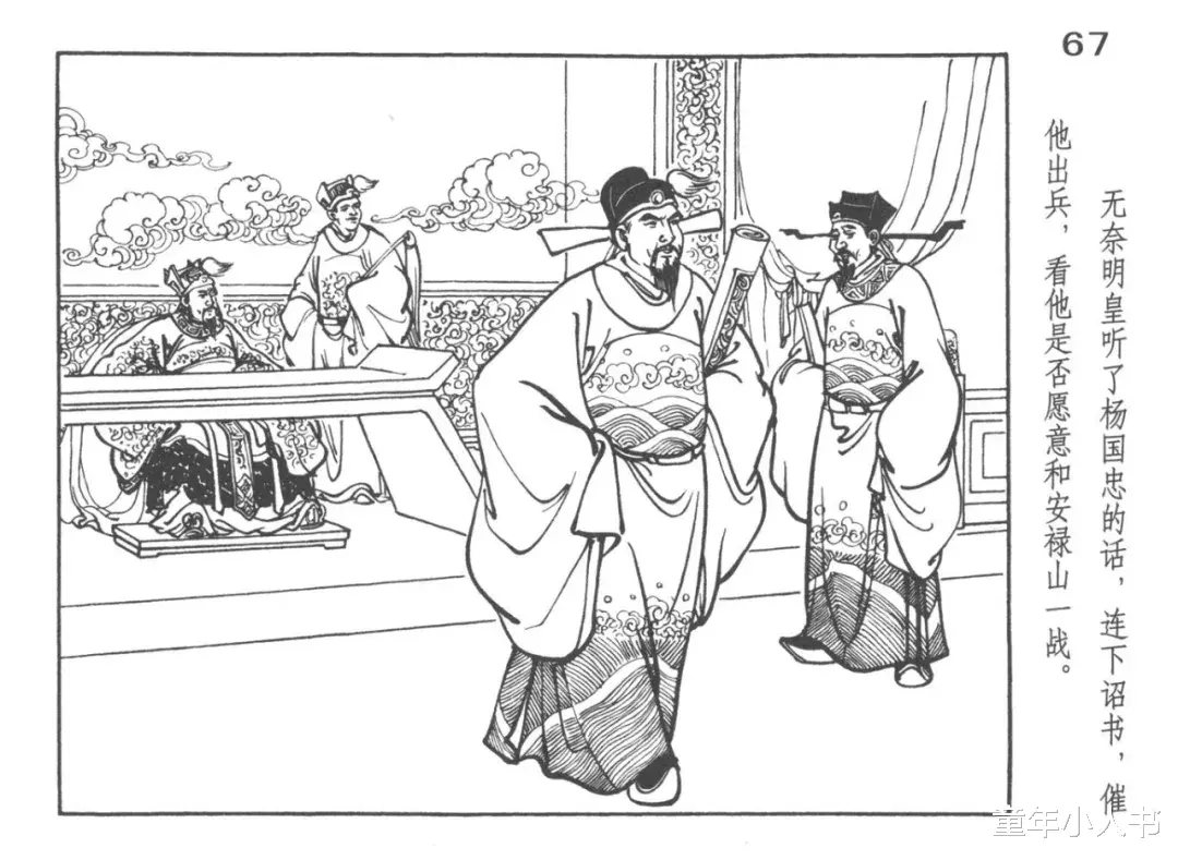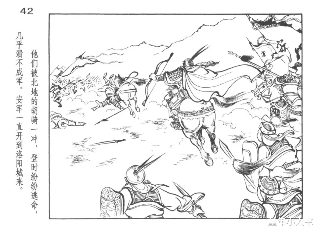 战争场面的浓缩:实际安史之乱爆发过程更为冗长,连环画则聚焦于"渔阳鼙鼓动地来"这一戏剧性瞬间,增强叙事冲击力。