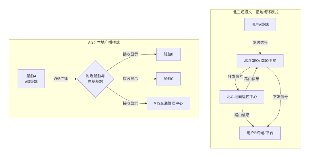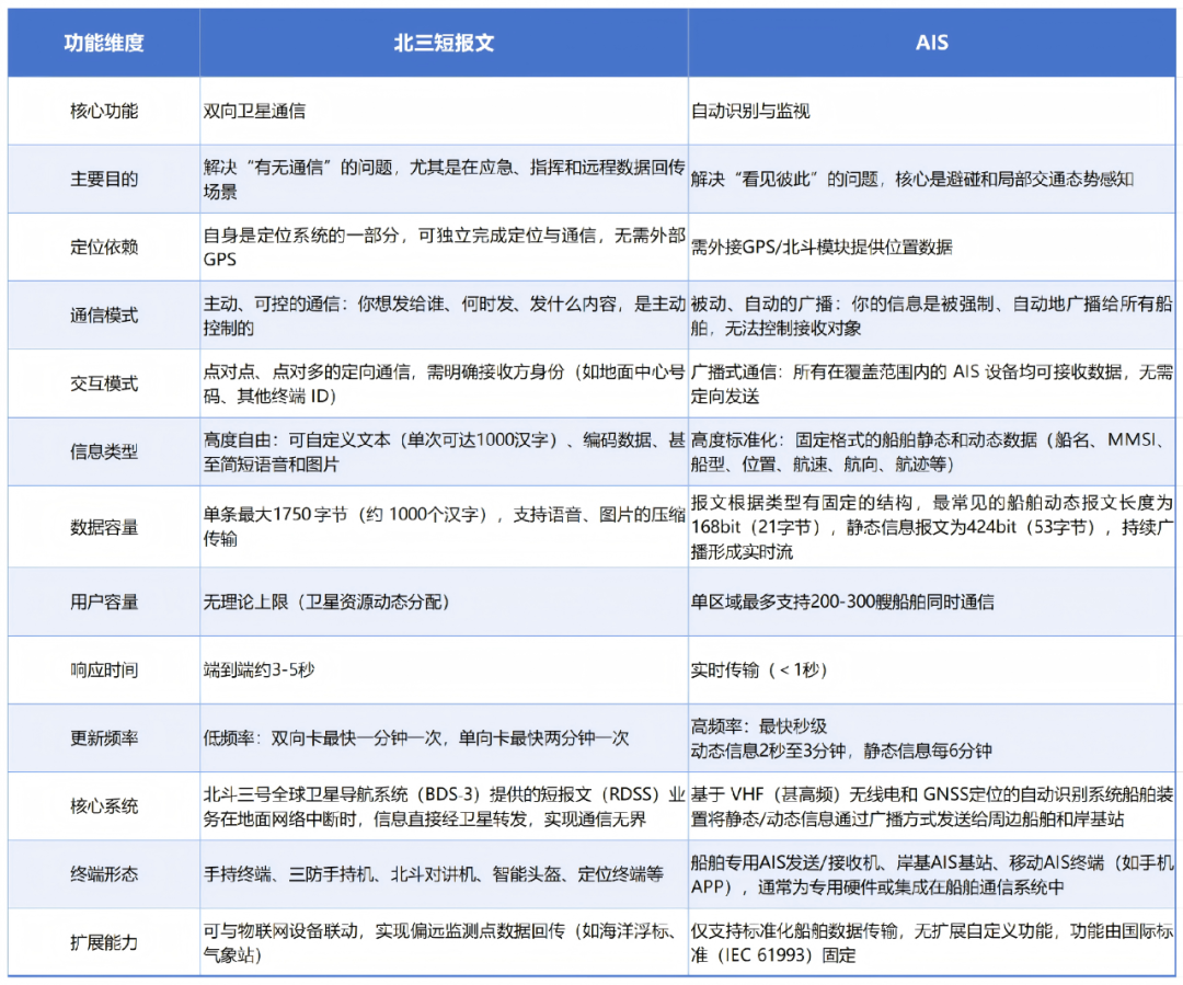 简单比喻:北三短报文是覆盖国内各点位的“紧急传声筒+坐标信使”,而AIS是海洋上的“交警指挥系统+车辆鸣笛示位”。