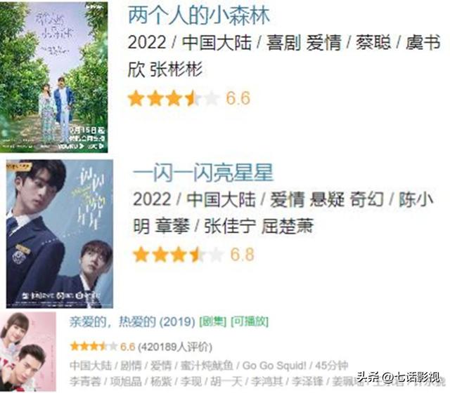 本年度现言黑马《一闪一闪亮星星》与热度颇高的《两个人的小森森》,以及三年前的现言爆款《亲爱的,热爱的》,都没能迈入7分大关。