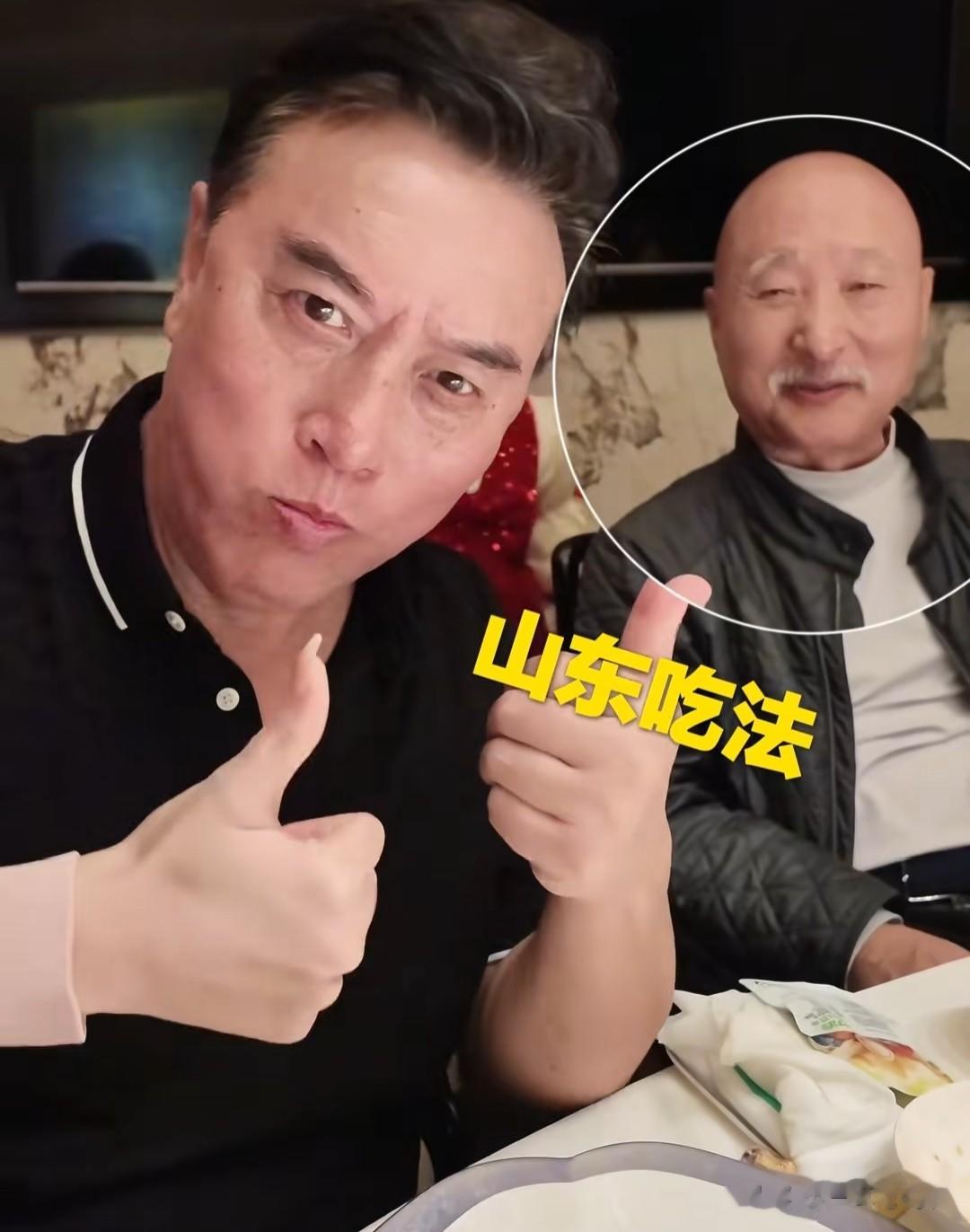 前面两个小辈各自“表演”完地道的烤鸭吃法,张山也来凑热闹,他直接把包烤鸭的饼皮放嘴巴上,再夹块烤鸭就着一起吃下,把一旁一开始认真看的陈佩斯都惊呆了,被逗的乐呵呵,直说他这是山东吃法。