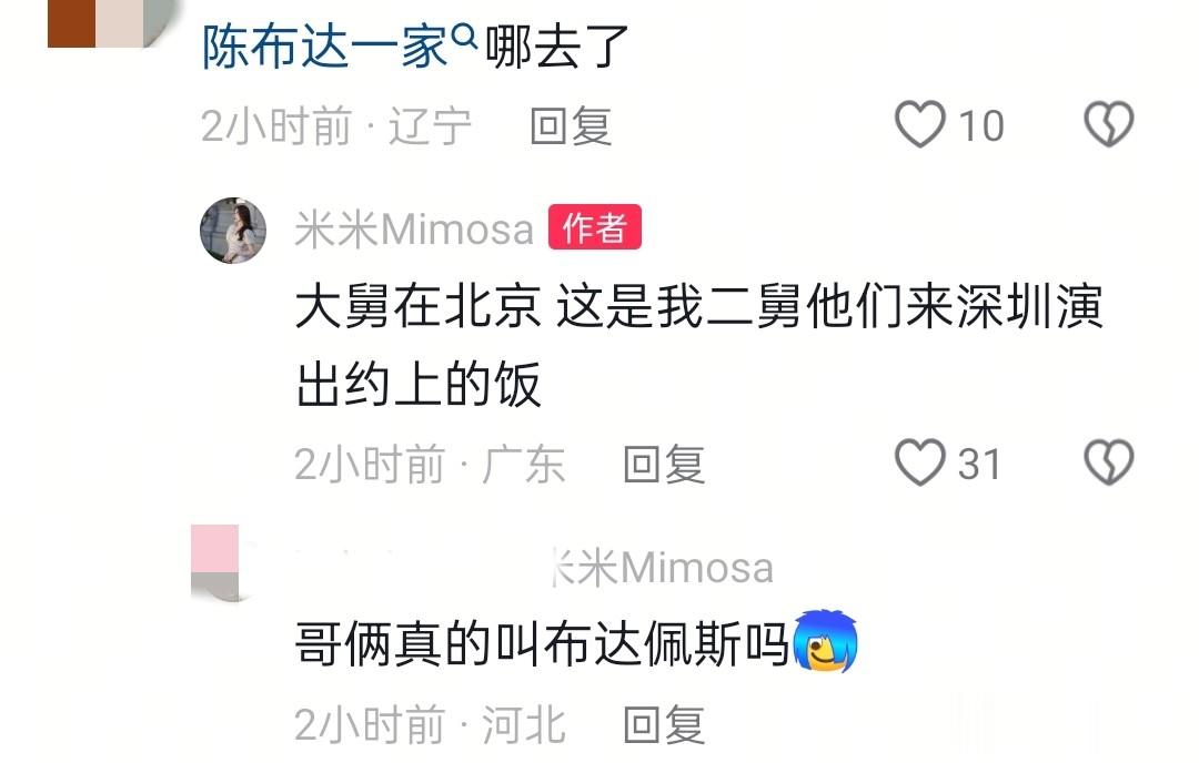 张嘉芸也在评论区回复网友,表示这次聚会地点是在深圳,而大舅在北京,二舅陈佩斯来这边演出才约上吃饭的,张嘉芸还特意点了舅舅爱吃的北京烤鸭。