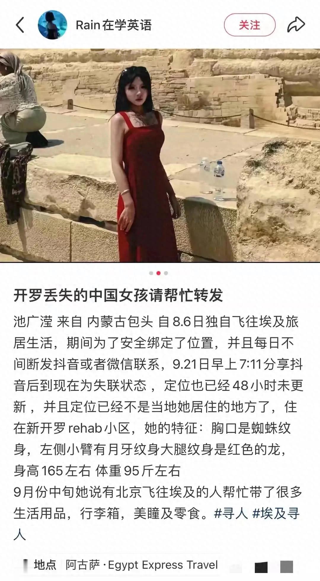 失联女孩叫池广滢,内蒙古包头人,她闺蜜李然(化名)那天在网上发了寻人启事,字里行间全是急劲儿。我记得李然在里面写,8月6号池广滢一个人飞埃及,说要“考察工作”,出发前俩人特意约好“每日报平安”,要么发微信,要么更条抖音,还绑了共享定位,就怕在国外孤零零的出意外。