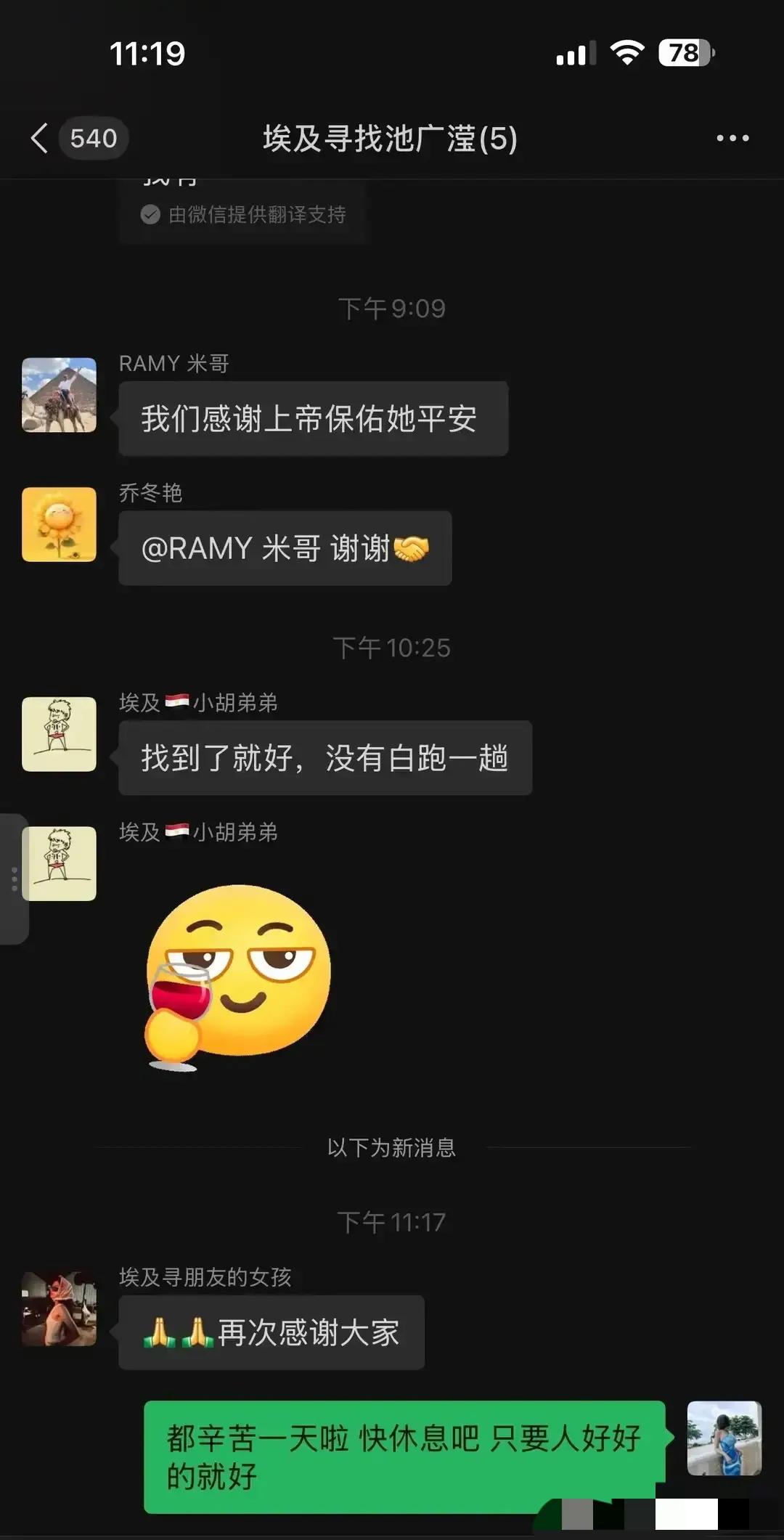 9月25号,李然缓过神来,赶紧帮着池妈妈联系了中国驻埃及大使馆。大使馆的工作人员特别给力,说“立马对接当地警方,优先帮忙找人”,这才让李然稍微松了口气。
