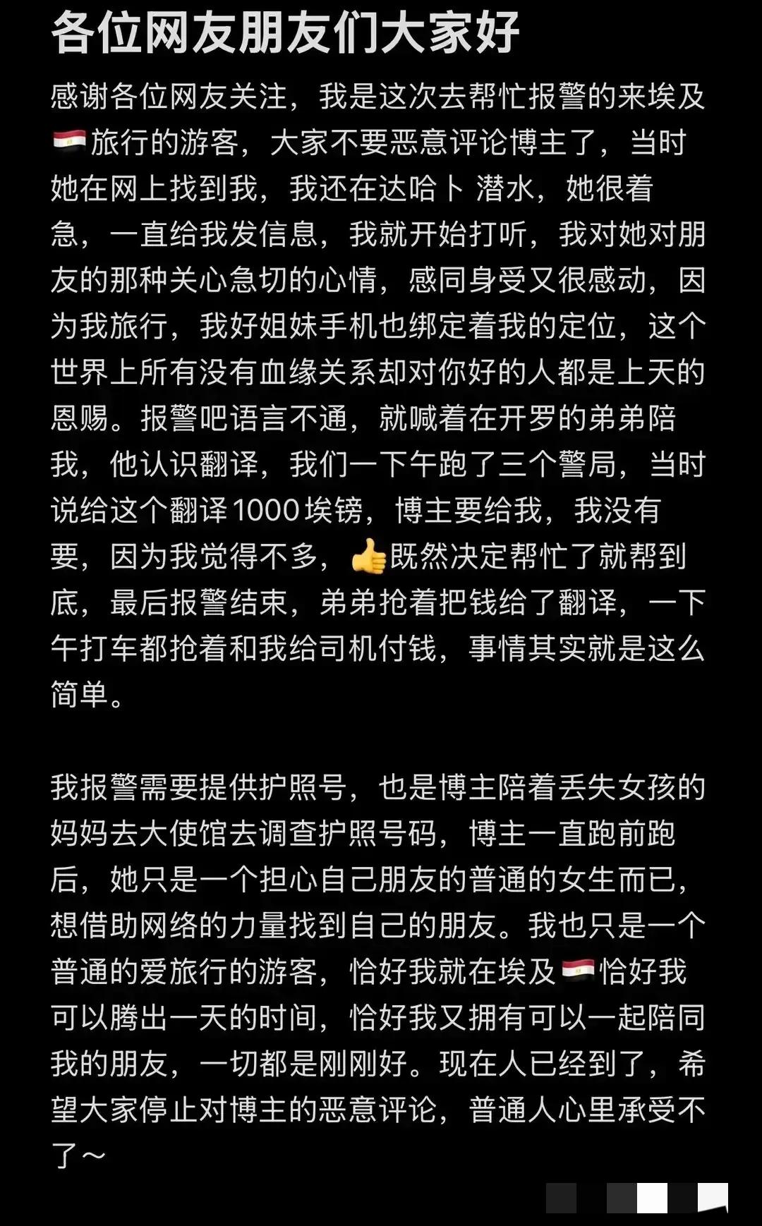 9月26号,这事儿被媒体报道后,直接冲上了热搜。#21岁中国女孩埃及失联# #埃及同胞接力寻人# 这两个话题,很快就排到了热搜前二十,评论区里全是祈福的话:“希望只是手机没电了,别出事儿”“大使馆加加油,快点找到人”“这么年轻的姑娘,在国外太危险了”。