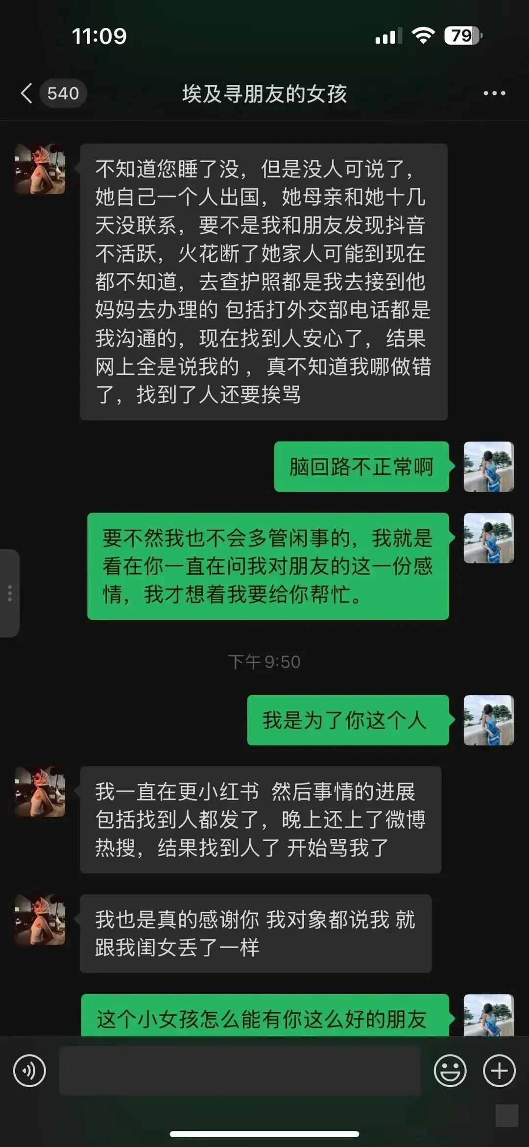李然后来在采访里说,那几天她根本没睡过一个安稳觉,凌晨三点还坐在客厅里刷手机,手指反复划着和池广滢的聊天记录,连对方之前发的“埃及的风都是暖的”那条朋友圈,都翻了八遍。“就盼着有个在埃及的同胞,哪怕说一句‘见过这个姑娘’也行啊”,她这话我特能理解,换做是我闺蜜在国外失联,我估计得急得满嘴起泡!