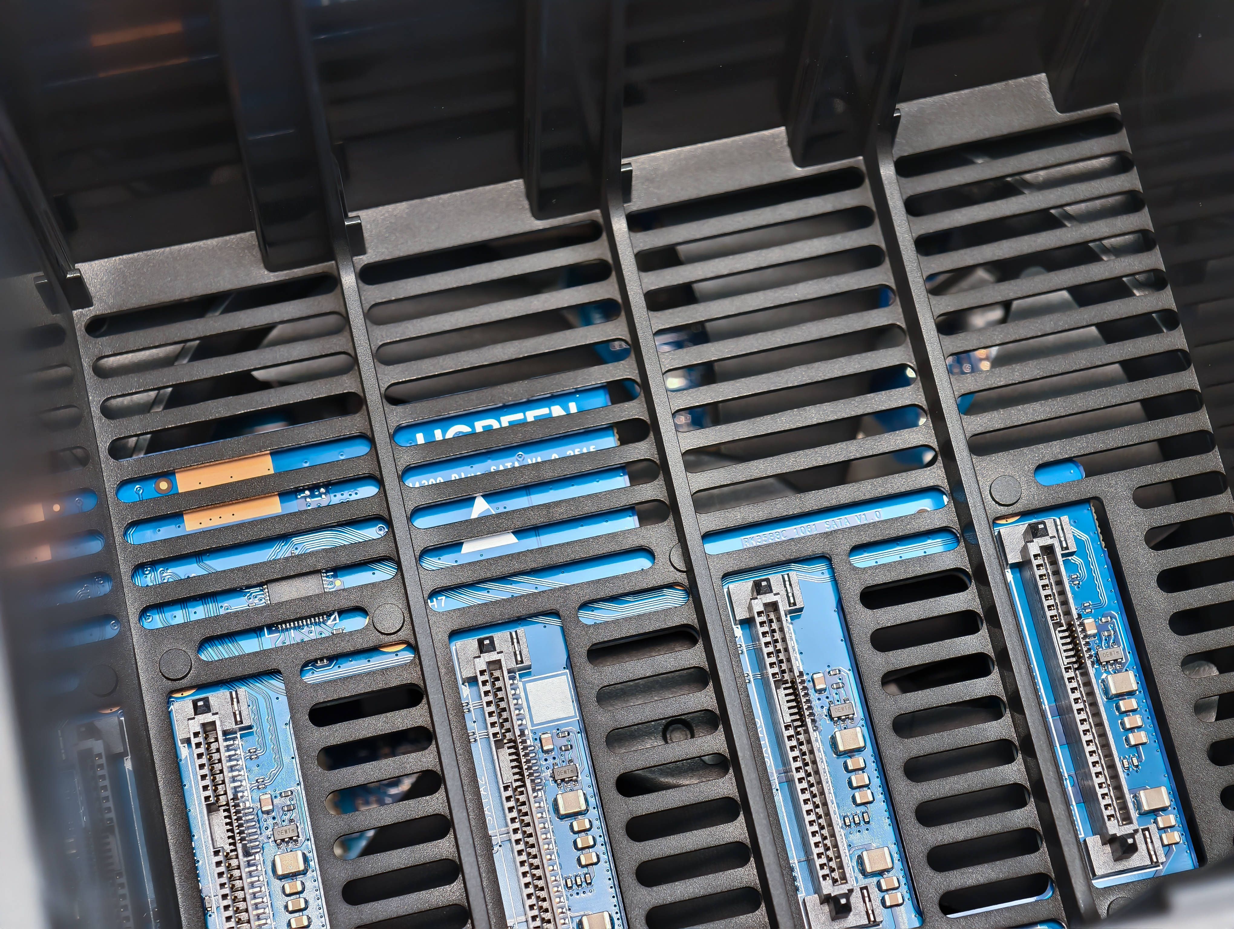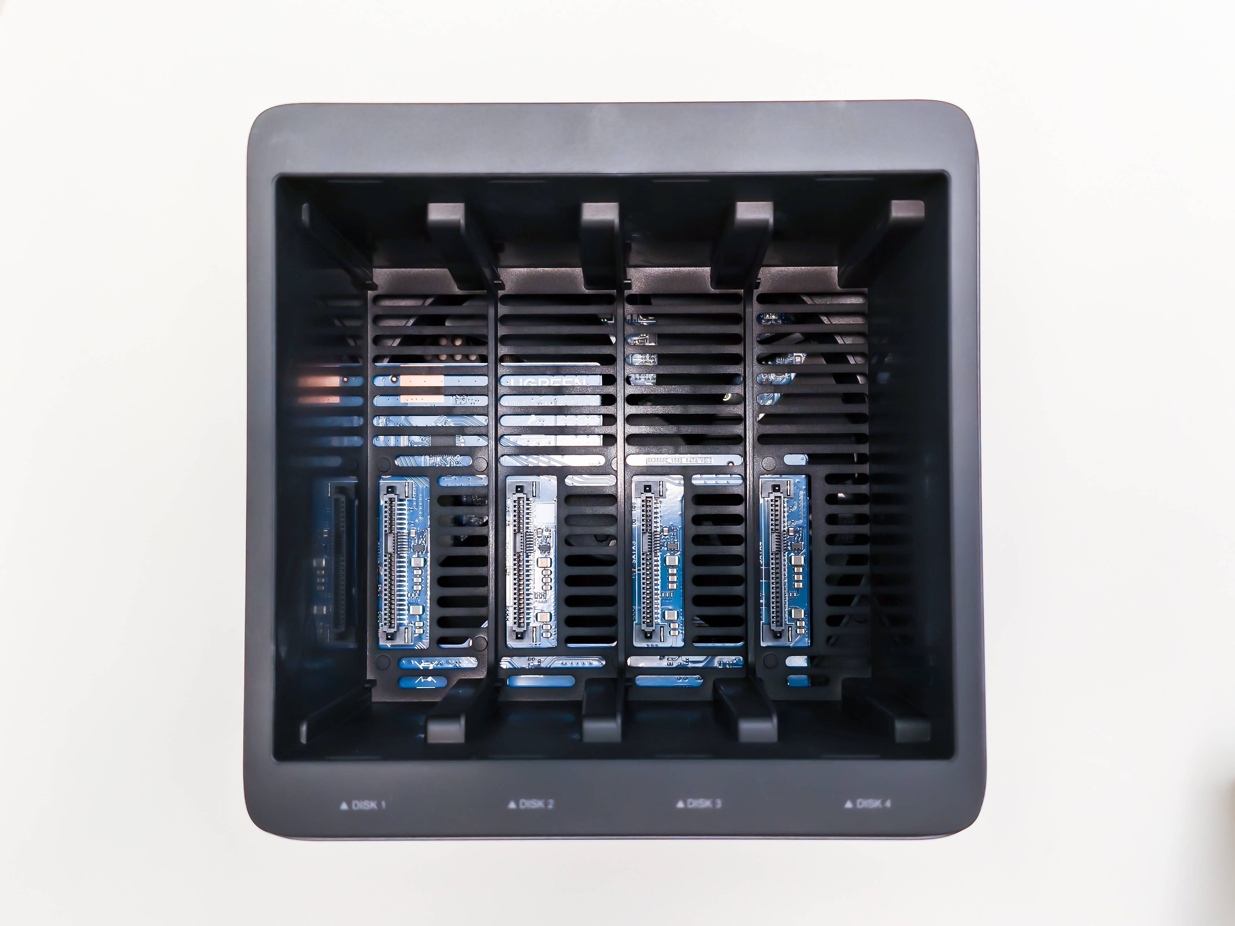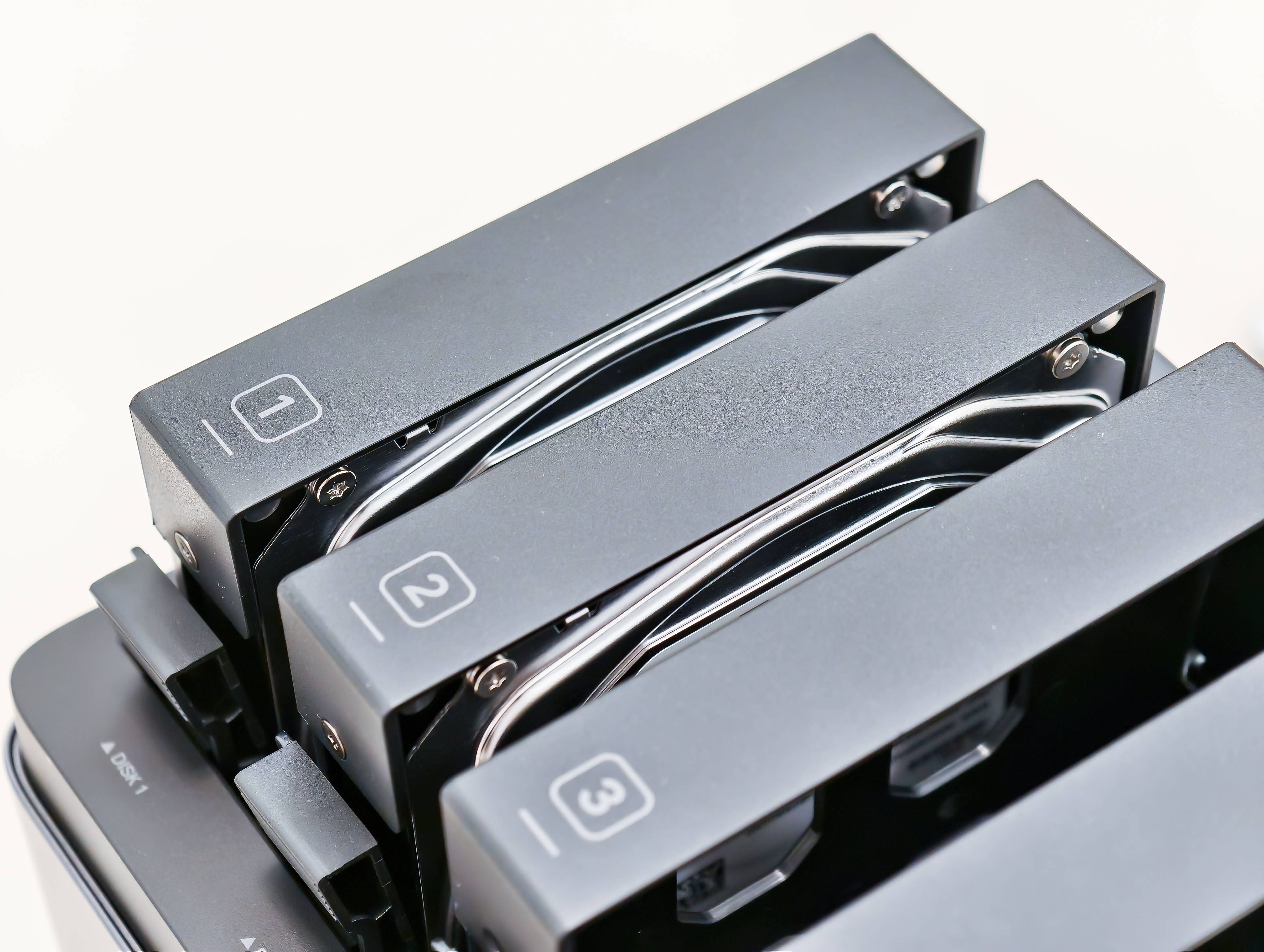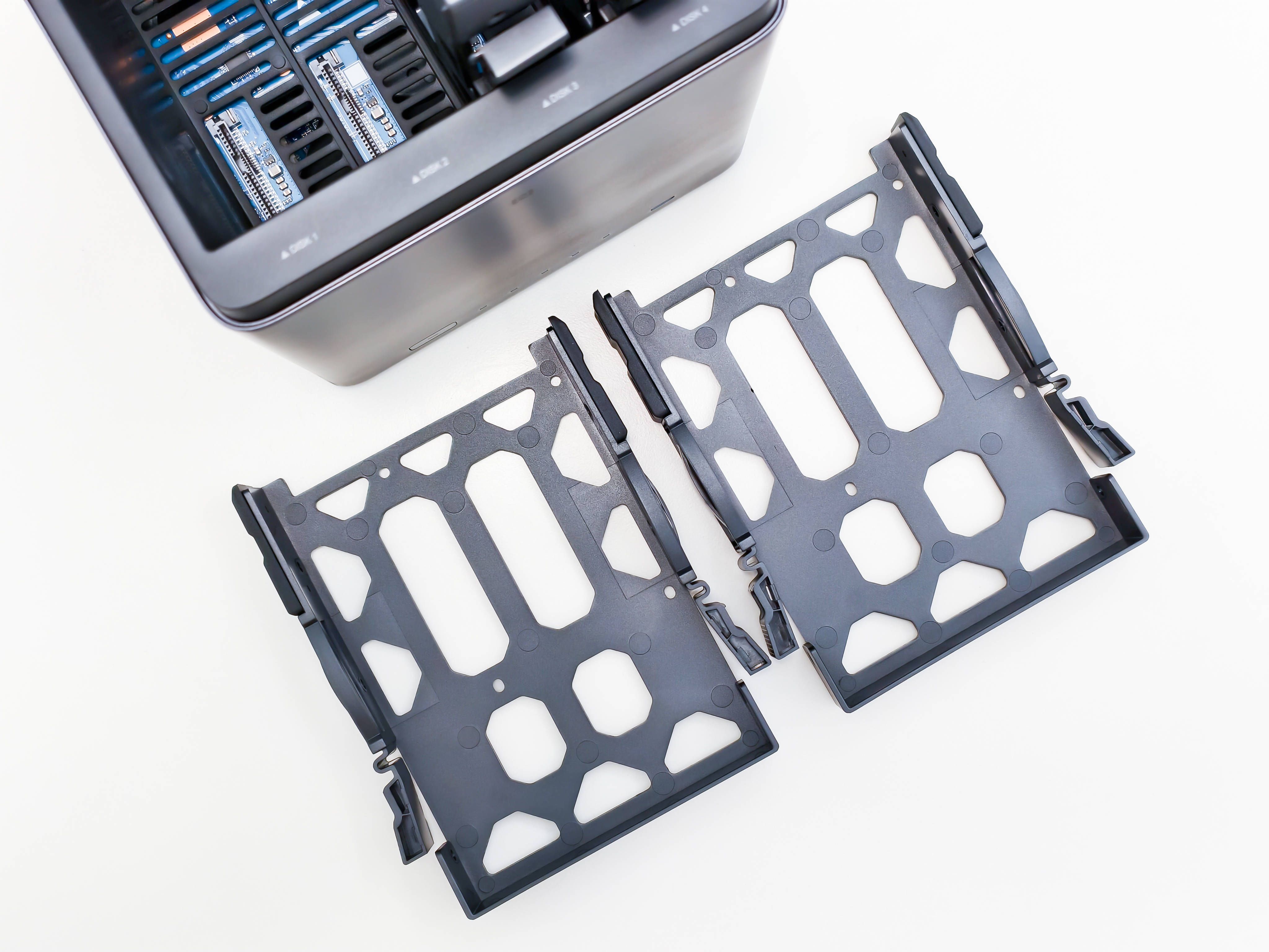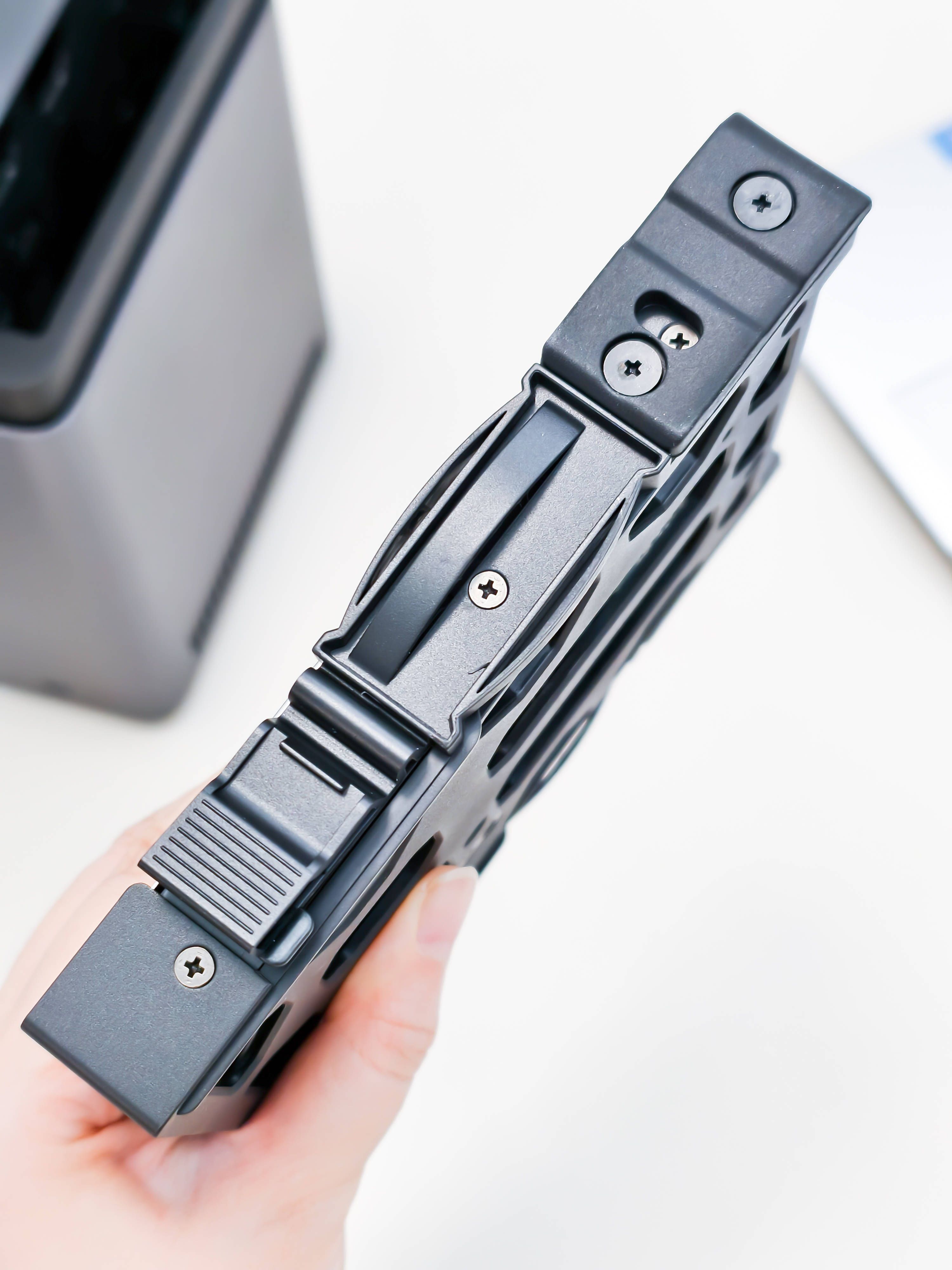 4个硬盘架都取出,可以看到采用竖插设计的卡槽,等会儿装好硬盘后,对准这个卡槽把硬盘捅下去就行了。最大支持120TB的总容量,足以储存海量的图片和影视等资料了。
