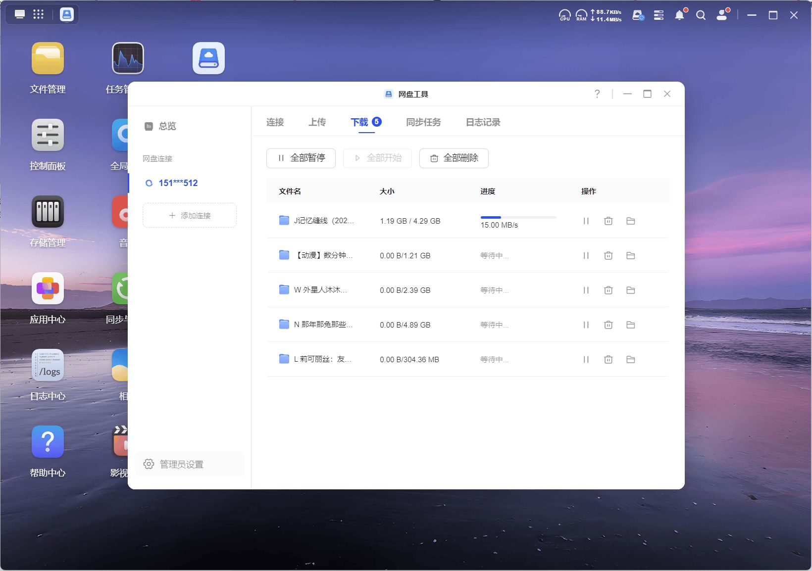 通过网盘下载功能,我们可以将动画和电影资源下载到绿联DH4300 Plus中。而且网盘工具的配置也相当容易,只需通过简单的账号登录和授权操作,就能轻松实现从百度网盘、115网盘、阿里云盘和Microsoft OneDrive等主流网盘上实现远程下载。