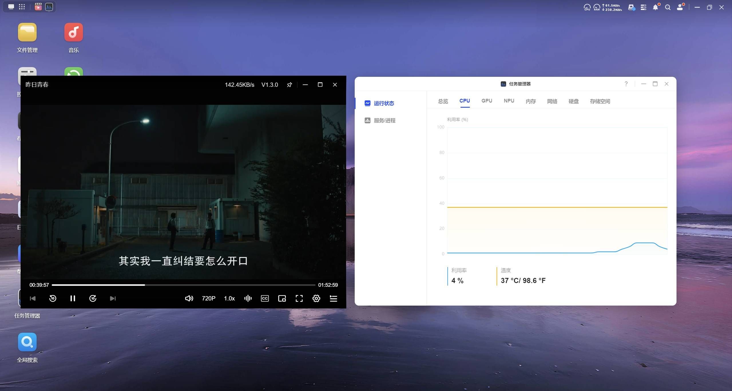 播放影片时,我留意了一下任务管理表,播放原画画质影片的CPU占用仅是1%,播放高清视频对绿联NAS来说毫无压力,真的太棒了。