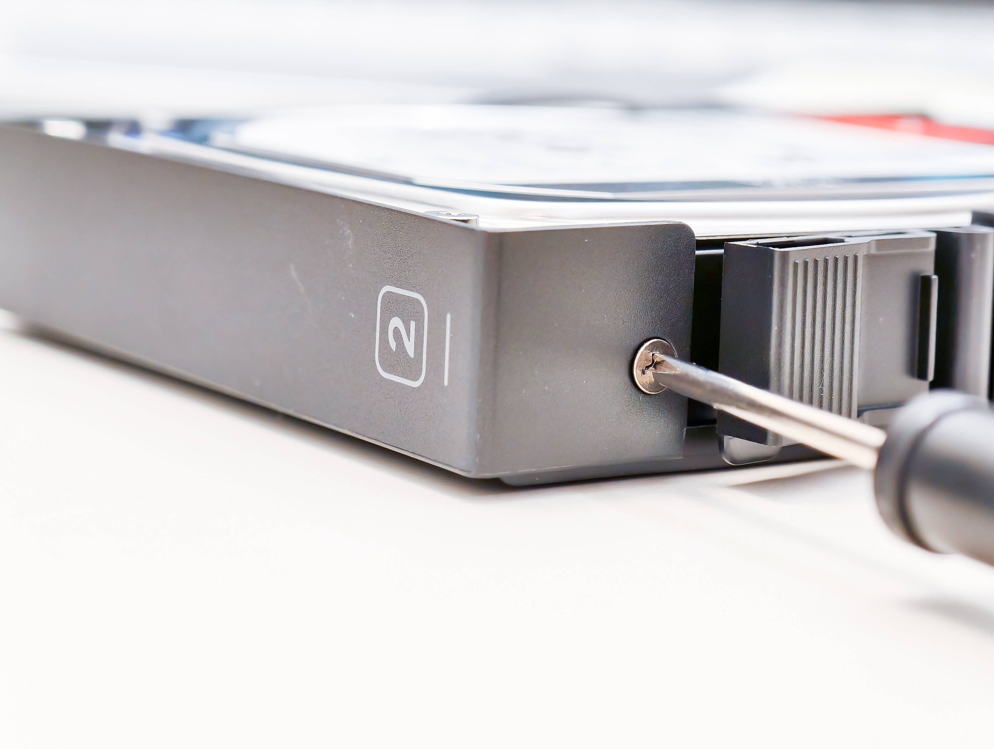 把硬盘用绿联NAS配套附赠的螺丝拧紧,左边3个,右边3个,拧紧6个螺丝就行了,比我想象中简单得多~