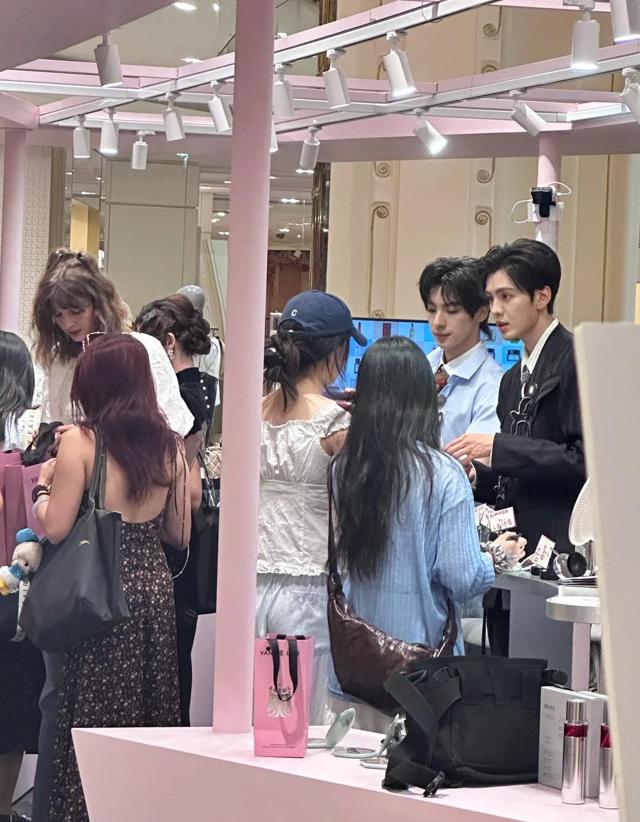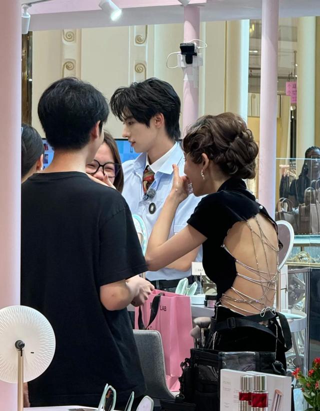 而像颜安、周峻纬、毕雯珺这些没有销售经验的小男生,也只能些一些明信片或是站在门口迎客了,张予曦、阿诺和赵昭仪这些有化妆经验的女明星,则是在给顾客试妆。