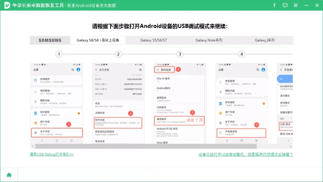 启动牛学长安卓数据恢复工具,您将看到如下界面。请使用 USB数据线连接您的手机与电脑。
