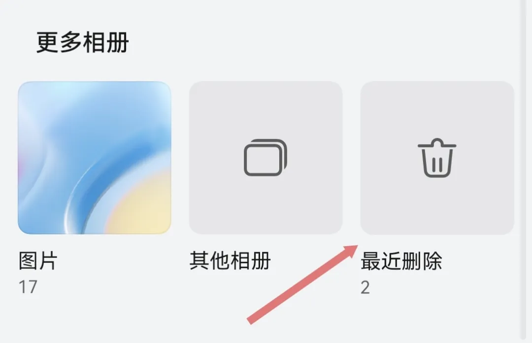 2、查找“相册”、“图库”或“设置”中的 “回收站”、“最近删除” 或 “废纸篓” 选项。