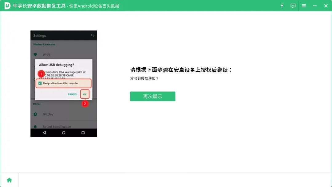 注意 :默认情况下,牛学长安卓数据恢复工具会自动访问您手机的最高权限。如果失败,请先root你的安卓设备。