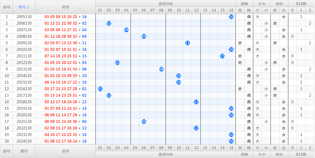 七、历史同期,蓝球开奖号码和走势图(历史数据演示):