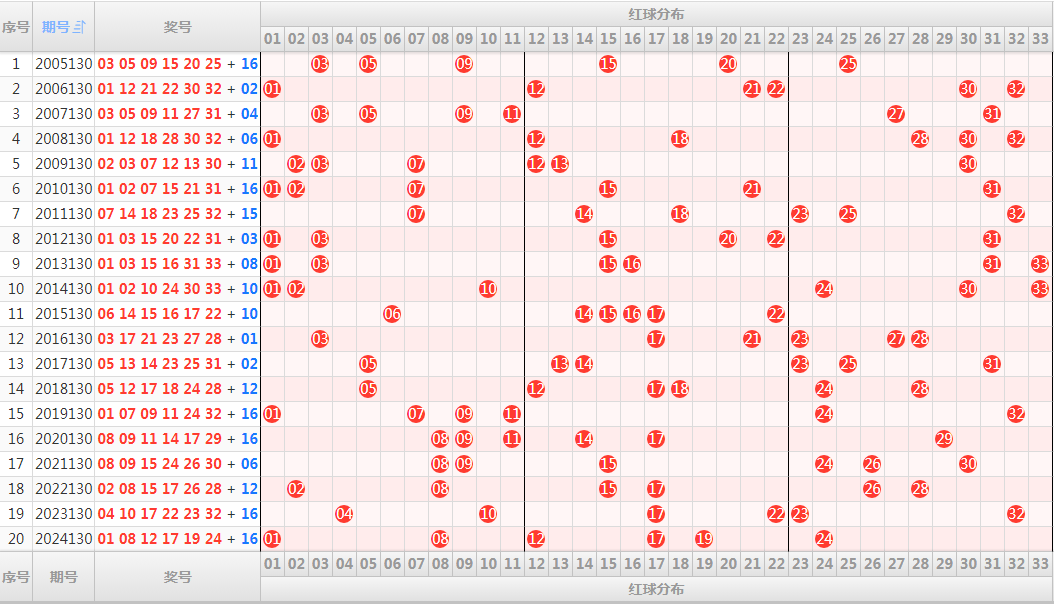 开奖号码结构:红球一对连号03、04,两对同尾03、13和20、30,没有重号。