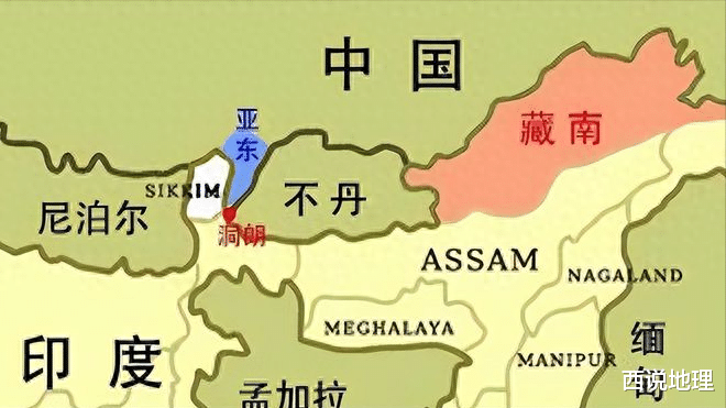 从地图上来看,洞朗地处喜马拉雅山南麓,周围被高山环绕,易守难攻,是一处天然的防御屏障。同时这里向南可直达不丹,向西跨过分水岭山脊可伸入印度锡金,距离印度平原仅有40公里,向南距离印度西里古里走廊更是只有100公里左右,西里古里走廊是印度本土进出东北地区唯一的陆上通道,被印度视为“生命线”,如果以洞朗作为战略支点,则可迅速切断这一走廊,因此洞朗也被视为进入西里古里走廊的关键跳板。这也是印度如此在意洞朗的主要原因。