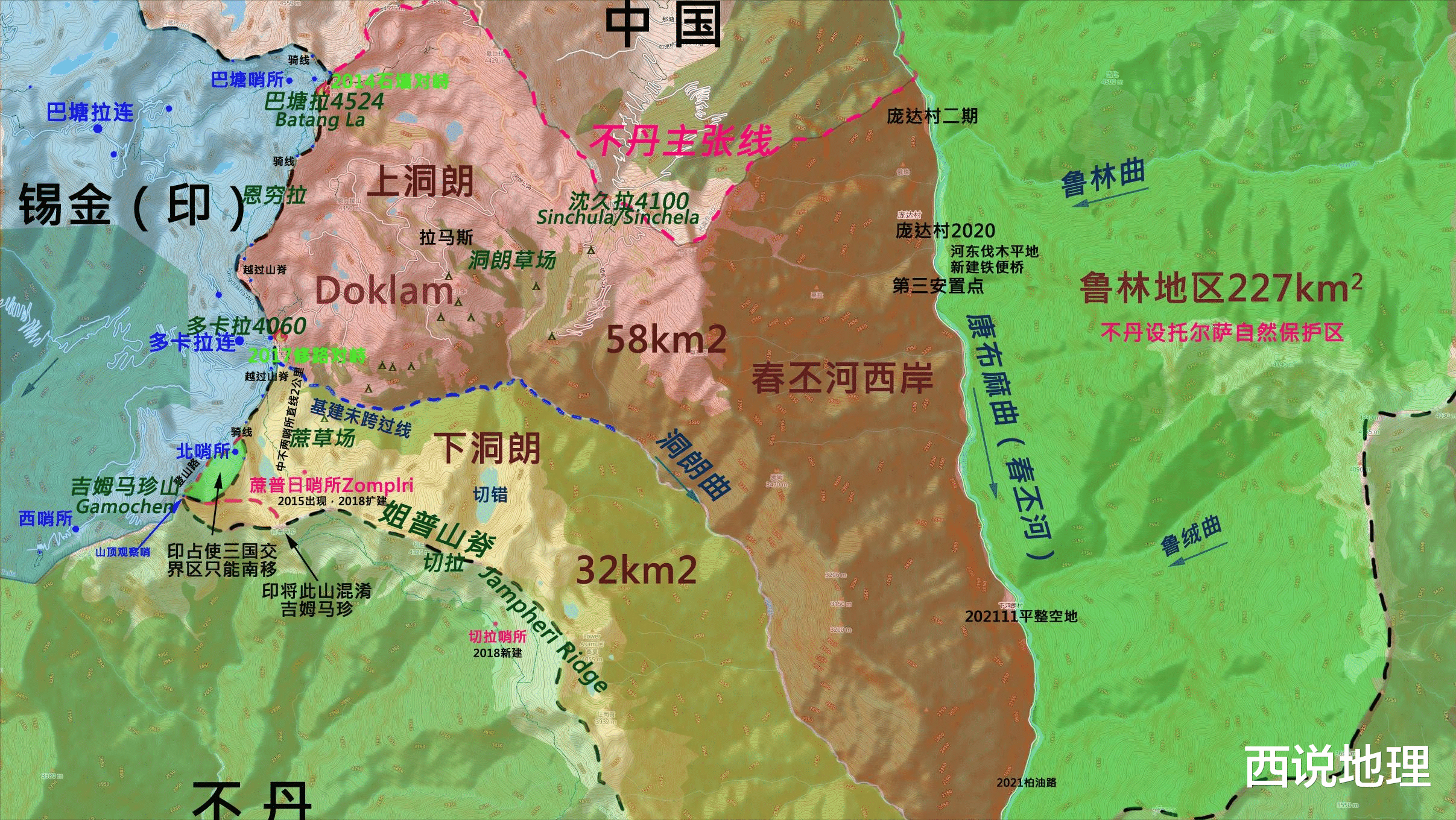 同时,庞达村还是洞朗地区首个行政村,号称“洞朗第一村”。洞朗地区是我国亚东县南侧与不丹交界的一处小盆地,西侧与印度锡金邦相邻,总面积109平方公里,历来是下亚东牧民的重要夏季牧场,自古便是我国领土,根据1890年,清朝与英国签署的《中英会议藏印条约》,明确了我国西藏与锡金之间的边界,其中,明确规定洞朗地区处于中国一侧,是我国无可争议的领土。1949年后,中印两国也均承认1890年条约的合法性,1975年开始,我国对洞朗地区实施定期巡逻,但印度对这一地区始终高度关注。2017年,印军跨过锡金段边界线100多米,进入我国境内阻挠我国的修路活动,而此次洞朗对峙事件,也进一步凸显了该地区特殊的战略价值。