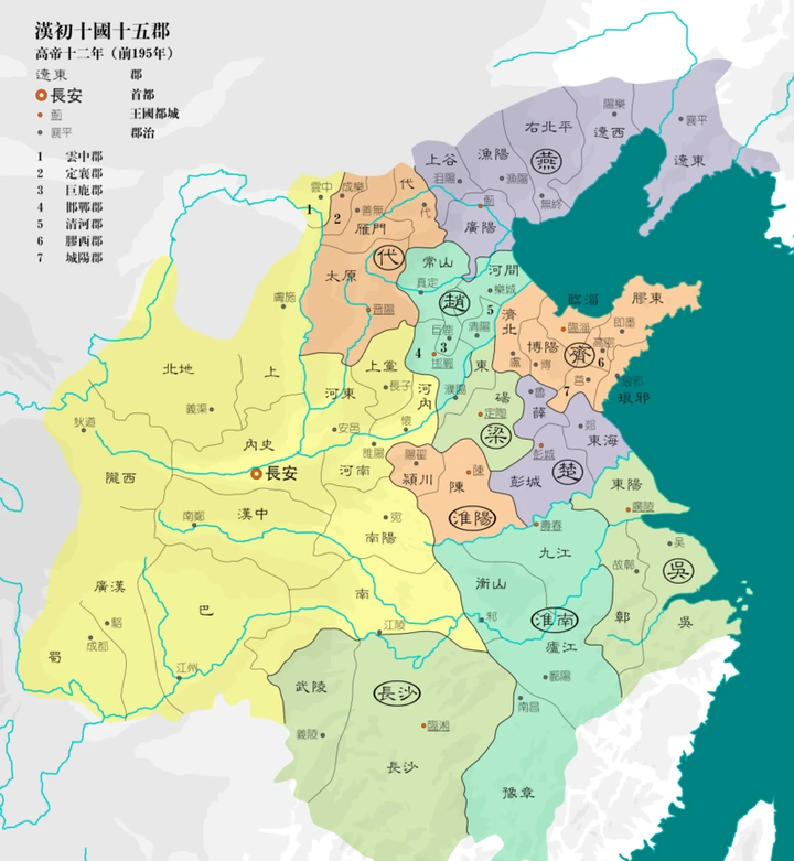 其中,汉是战国秦政权及韩国的继承人;赵、代则是赵国继承人;梁继承了魏国;楚、淮阳、淮南、吴、越是楚国继承(注意此五国的疆域极为接近战国晚期楚国疆域);齐、燕则继承了战国的原身。