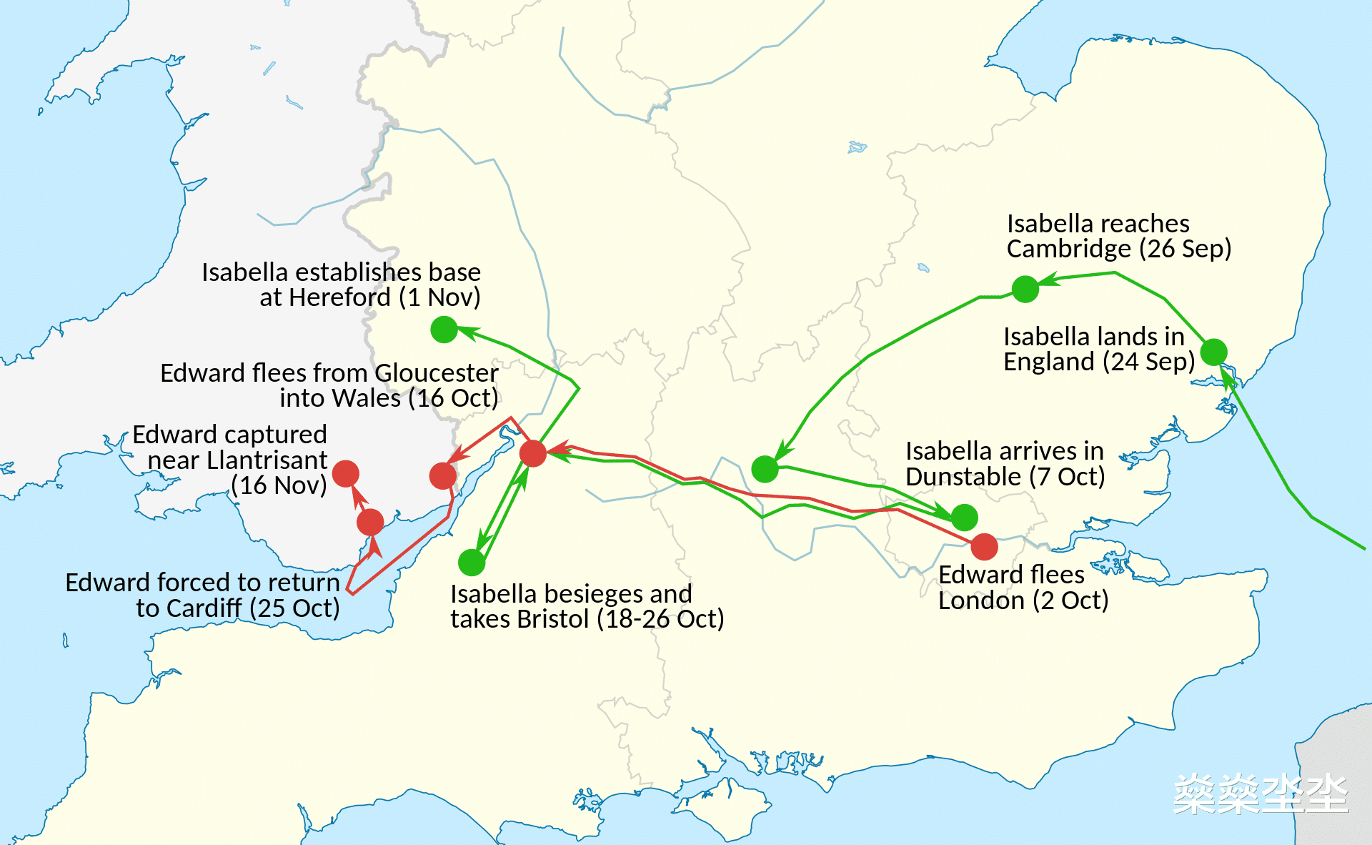 哥哥查理四世的暗中支持还不够,伊莎贝拉撮合儿子与荷兰伯爵的女儿埃诺的菲利帕订婚,然后利用菲利帕丰厚的嫁妆,组建了一支雇佣军,在英格兰流亡者的增援下,登陆英格兰东部。
