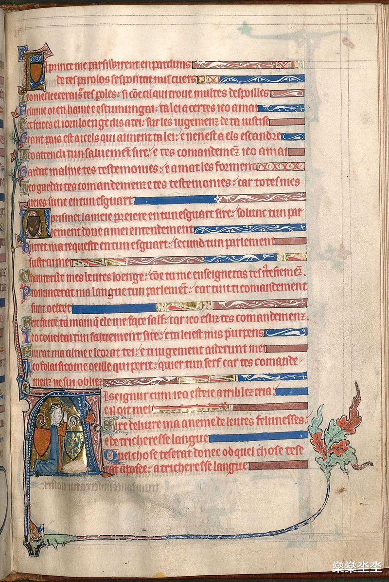 伊莎贝拉女王诗篇中的一页,可能是结婚之际提供。她的肖像出现在法国和英国国徽首字母之间