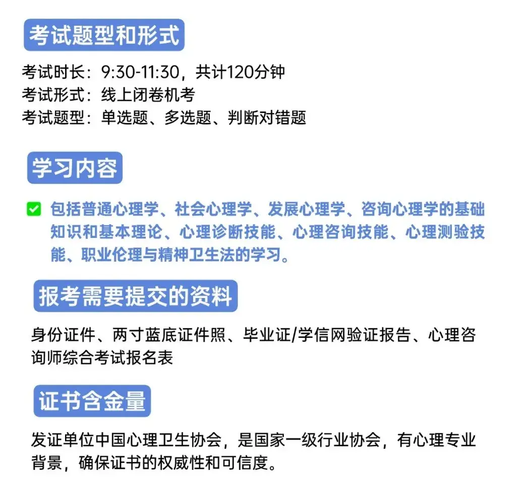 目前市场上的心理咨询师证书有很多,其中推荐报考中国心理卫生协会《心理咨询师专业技能培训合格证书》,其证书课程包含了人社部心理咨询师教材内容,具有较高的含金量。