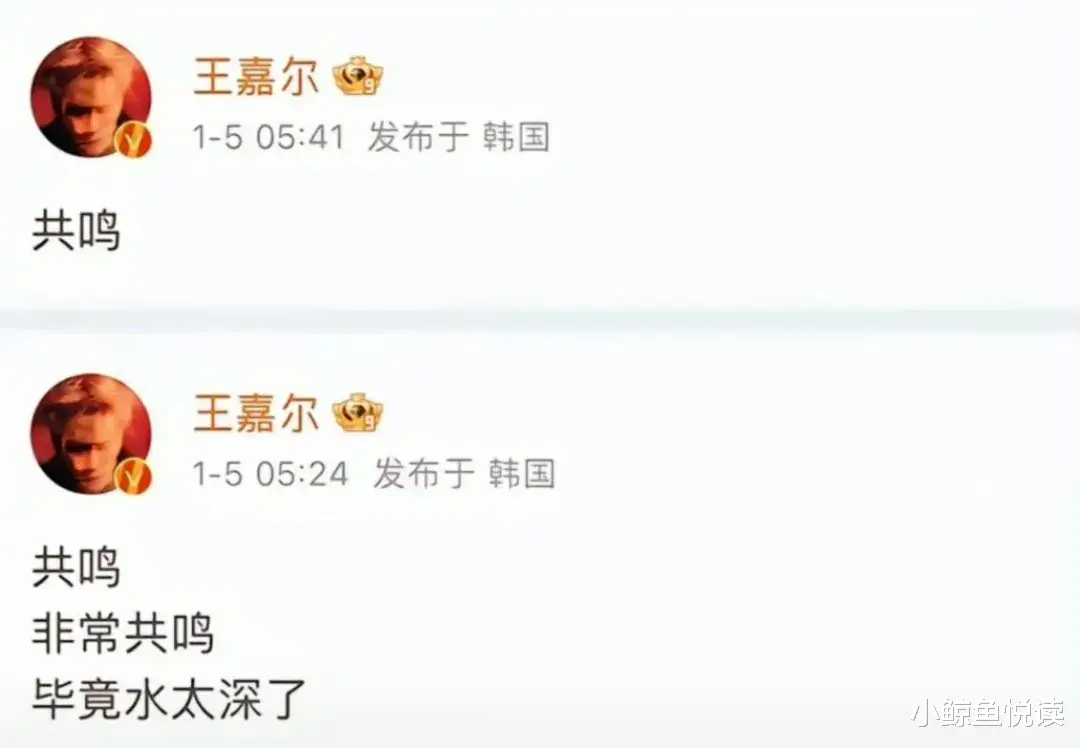 就在事情发酵的火热时,王嘉尔的一条微博,受到了关注,疑似是对这件事情的评论,一句“共鸣”,不知道是否也与娱乐圈的一些“深水”有关。