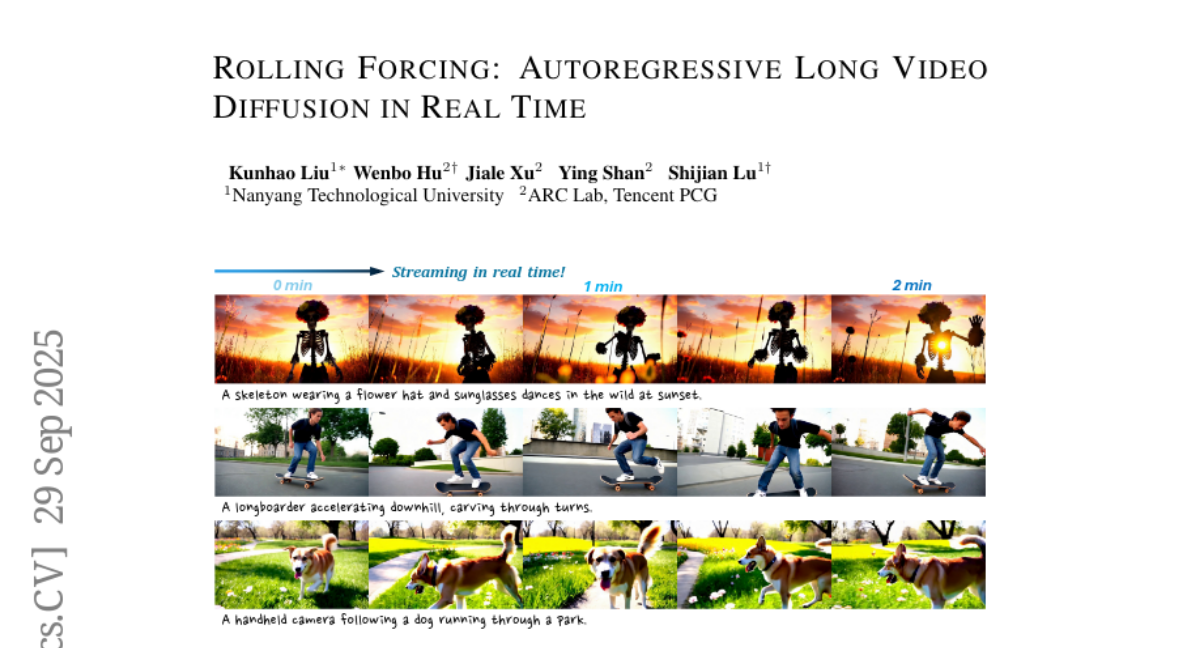 这项由南洋理工大学陆世建教授团队、腾讯PCG的ARC实验室胡文博、徐嘉乐、单颖等研究人员共同完成的研究成果于2025年9月发表,论文题为"Rolling Forcing: Autoregressive Long Video Diffusion in Real Time"。有兴趣深入了解的读者可以通过论文编号arXiv:2509.25161查询完整论文。这项研究解决了一个令人兴奋但又极其困难的技术挑战:如何让计算机像电视台播放节目一样,源源不断地生成高质量的视频内容,而且还要做到实时播放,不能有明显的卡顿或画质下降。