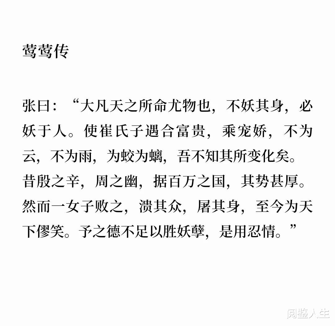 元稹在书中写道,崔莺莺是“不妖其身,必妖于人”的尤物,