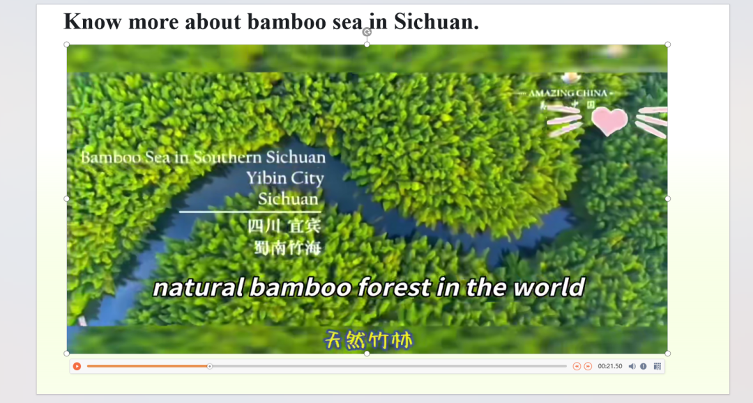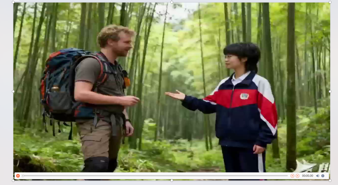 本次公开课的高潮部分当属“Scenario Role Playing”(情景角色扮演)环节。万千老师让学生扮演四川竹海的导游,为一名外国游客介绍其环境,并借助AI生成对话视频,为学生提供语言示范和情景支架。随后,同学们以小组合作形式,上台表演,进行实践对话,锻炼学生英语口语能力、团队合作意识和创造性思维。