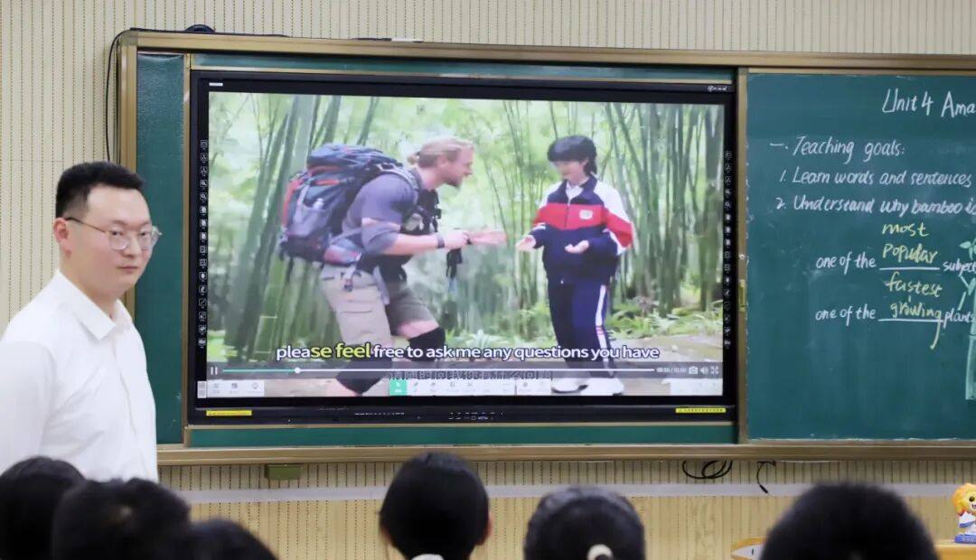 课堂伊始,万千老师通过一段与熊猫“盼盼”的AI生成对话视频导入新课。视频中,可爱的熊猫形象用流利的英语与学生打招呼,瞬间吸引了全体学生的注意力。教师随后引导学生借助智能软件与AI智能体进行实时互动,这一创新设计不仅极大地激发了学生的学习兴趣,更使AI技术成为课堂的有机组成部分,让学生在实践中感受人工智能赋能学习的魅力。