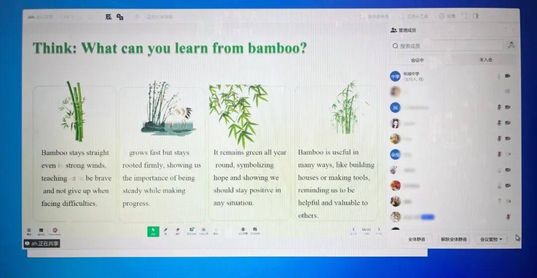 在回顾提升环节,万千老师抛出问题——“What can you learn from bamboo?”(你能从竹子中学到什么?),引发学生思考,让课堂从单纯的文化学习自然延伸到文化认知领域。学生深入探讨了竹子在中国文化中的象征意义,“Bamboo stays straight even in strong winds, teaching us to be brave and not give up when facing difficulties”(竹子即使在强风中也能挺直腰板,它教会我们在面对困难时要勇敢,不要放弃。)等等,让学生在学习文化知识的过程中获得精神的滋养与品格的启迪。