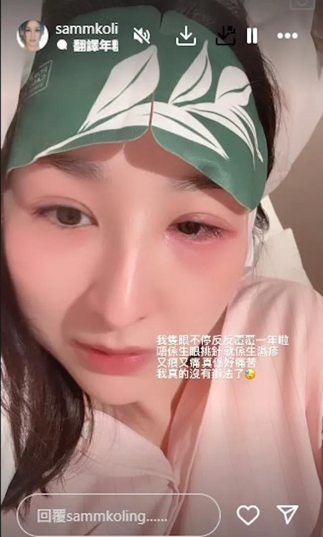最近她在社交平台贴出了一段短片,只见她在片中诉苦眼睛究竟要肿到什么时候。而且肉眼可见她的一双眼又红又肿,十分影响美观。