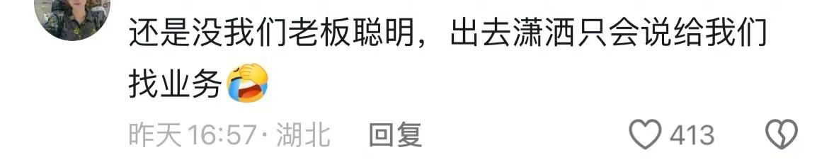 这一看就是上过班的,一针见血。还有网友留言:还是没我们老板聪明,出去潇洒只会说给我们找业务。