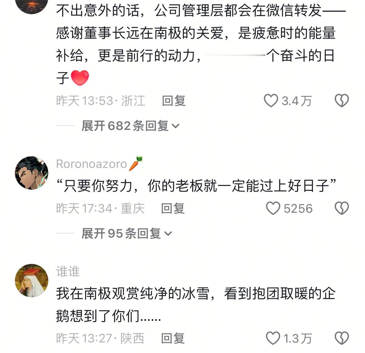 还有网友说:不出意外的话,公司管理层都会在微信转发——感谢董事长远在南极的关爱,是疲惫时的能量补给,更是前行的动力,照亮每一个奋斗的日子。