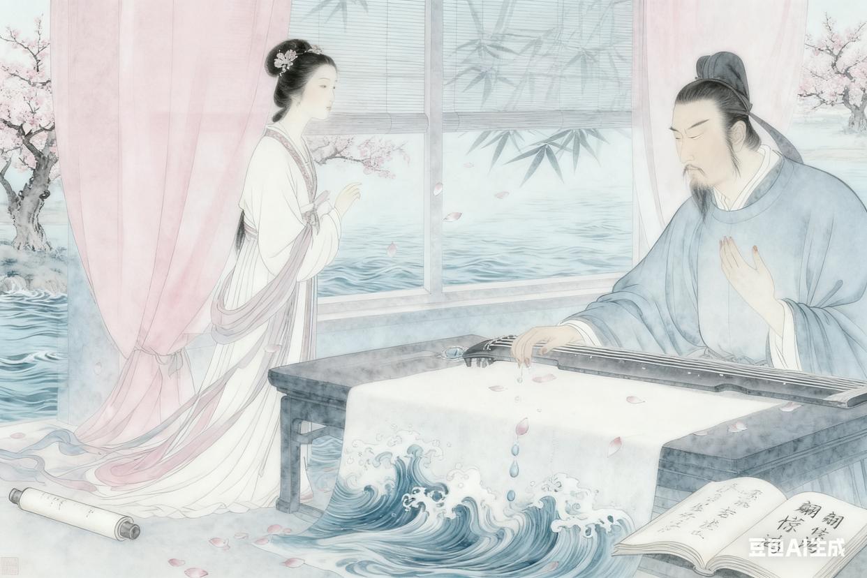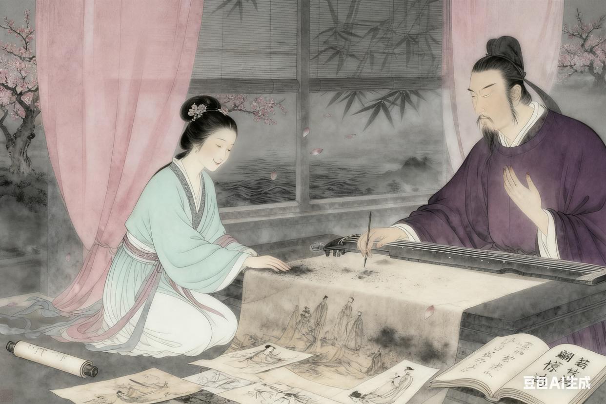 他找来了最好的绢布,铺在窗前的案几上,又把《洛神赋》抄在纸上,贴在绢布旁边。每天清晨,他就坐在案前,对着桃林发呆,花瓣落在绢布上,他就照着花瓣的形状画洛神的衣袂;傍晚,河边有女子洗衣,笑声顺着风飘过来,他就把那声音融进洛神的神情里。