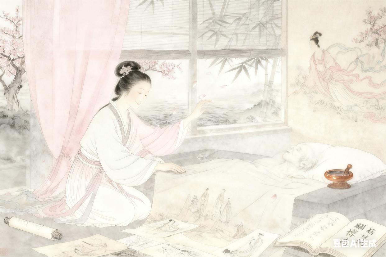 义熙元年的冬天,顾恺之病倒了。他躺在病床上,让家人把他的《洛神赋图》挂在墙上,又把那方磨得发亮的砚台放在枕边。弥留之际,他伸出手,像是要去触碰画上的洛神,嘴唇动了动,却没说出话来。家人凑近听,只听见他轻轻叹了口气,像风吹过桃林,又像琴声落了尾音。