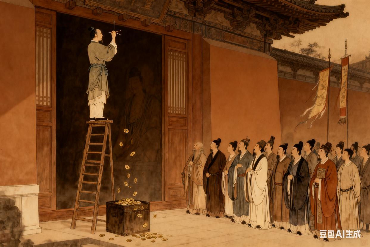第三日傍晚,寺门重新打开,顾恺之让人在墙前摆了张案几,放了个捐钱的木箱,又在旁贴了张纸:“凡观画者,先捐十万钱,方可看我点眸子。”消息像长了翅膀,一夜间飞遍建康城。第二日清晨,寺门外排起长队,富商、文人、甚至宫里的宦官都来了,十万钱扔在木箱里,叮当作响。顾恺之站在梯子上,手里捏着一支细如发丝的狼毫,蘸了淡墨。人群静得能听见风吹动幡旗的声音,他的手悬在维摩诘的眼眶上方,停了足足一炷香的时间,才轻轻落下。