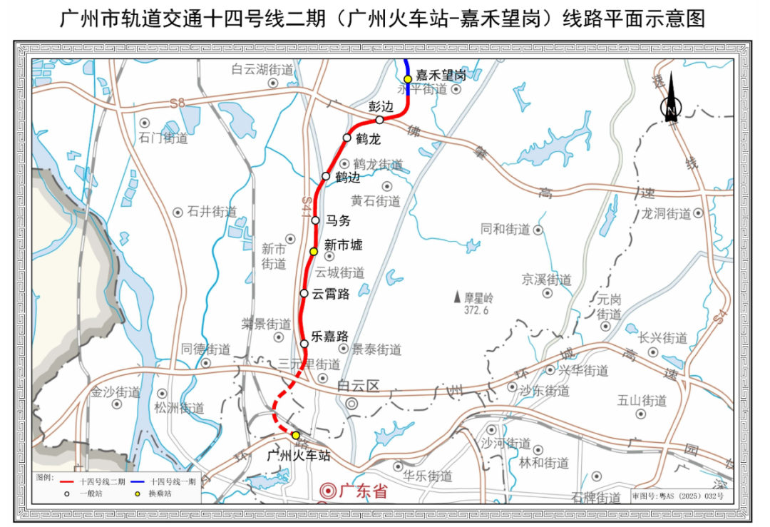 *地铁13号线二期线路图其次是14号线二期,即将开通的是嘉禾望岗站(不含)至乐嘉路这段,是白云和越秀的“亲密线”,串联两大集散枢纽。