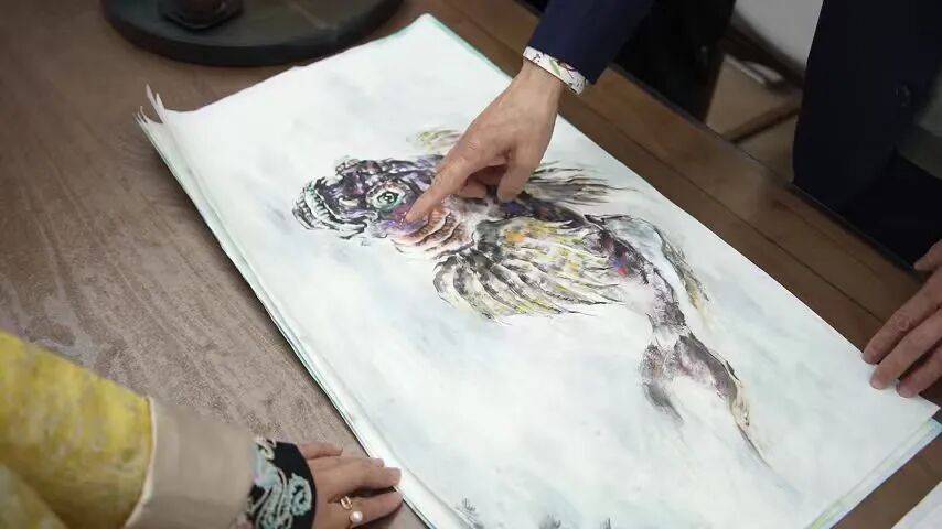 张传斌作为“海洋画”代表人物,其作品以独特的笔墨语言描绘江河湖海的壮阔气韵,融合传统国画技法与现代审美意识。《长江瑰宝》不仅展现出长江流域的16种稀有鱼类,更传递出对生态文明与人文传承的深刻思考。