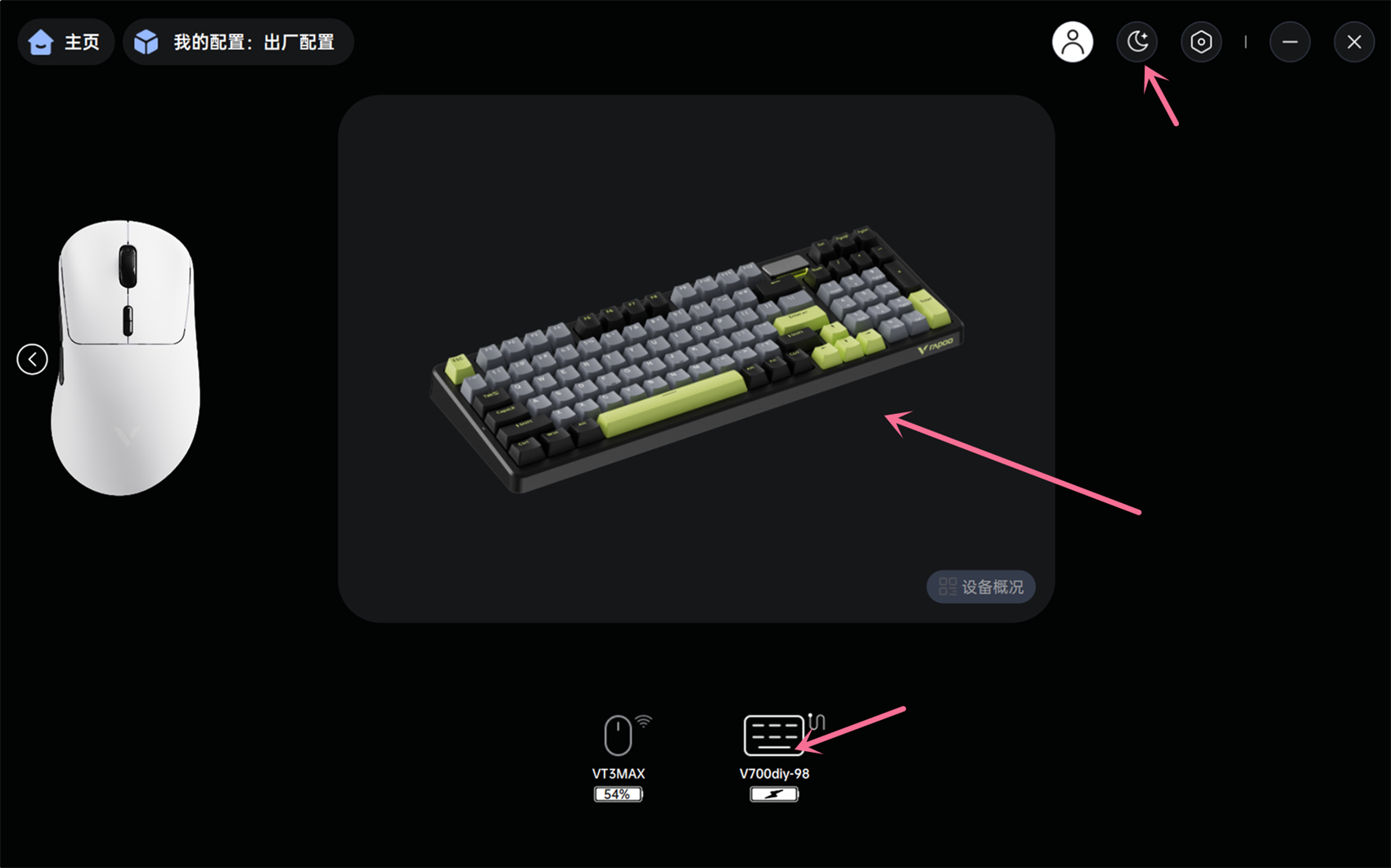 驱动软件可以同时管理多个硬件,比如我的VT3MAX也在列,界面可以调明暗主题,当然也可以跟着系统走。点击就可以键盘进入管理界面了。