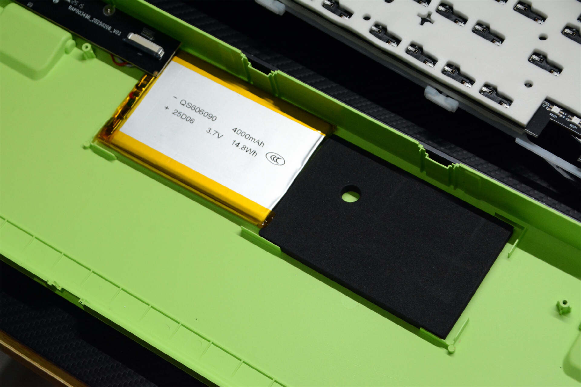再仔细看键盘内部,能发现一块填充的黑色海绵,依我判断,这大概率是预留的扩展空间。要是你也想折腾折腾,给键盘扩充电池容量其实并非不可能;只要动手能力够强,找对适配的电池,把这块空间利用起来,电量直接翻倍也不是没可能实现。