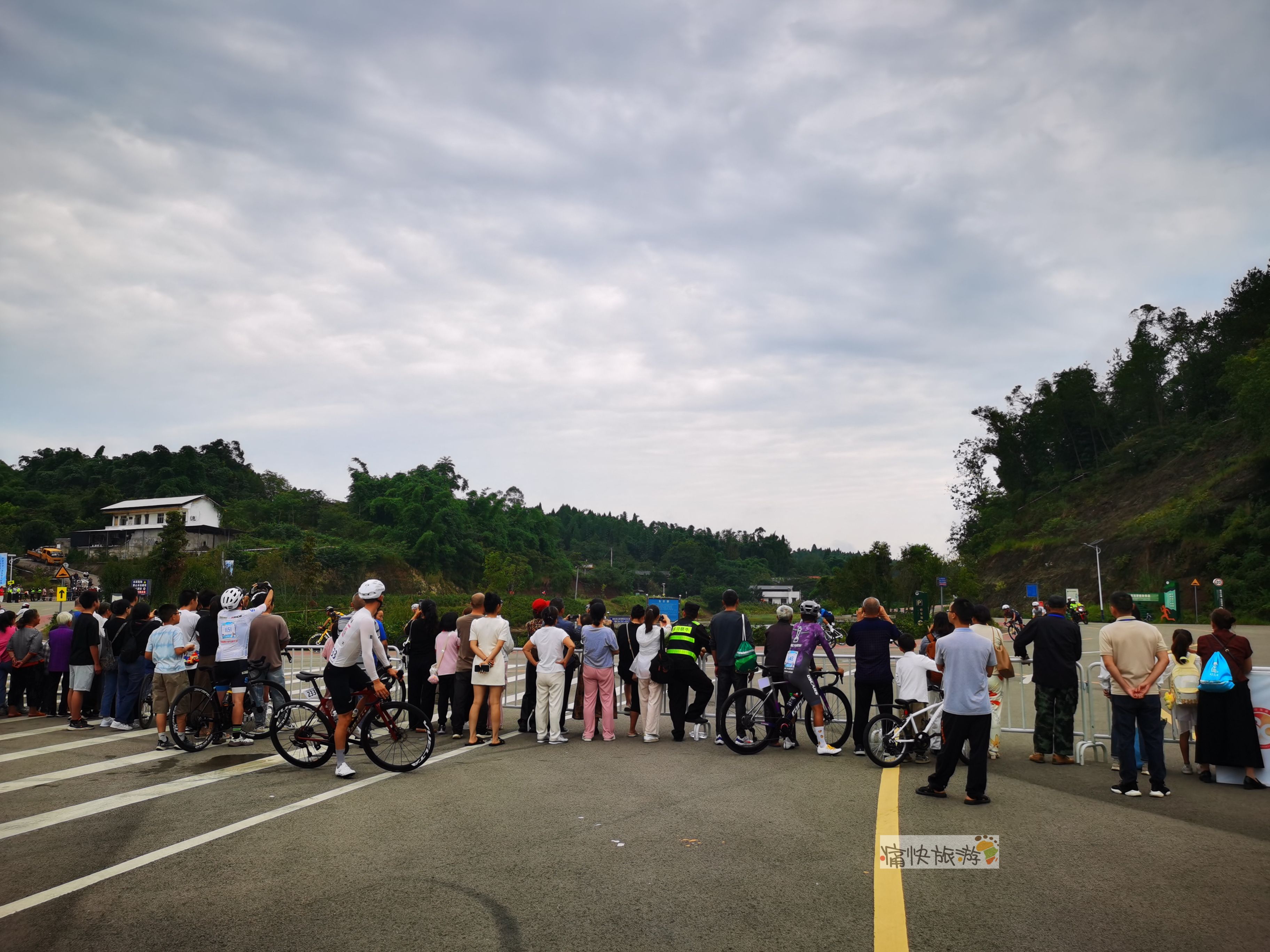 青龙湖广场边的赛道护栏已围满了观众和候场选手,都在等待比赛选手通过这个大弯道。