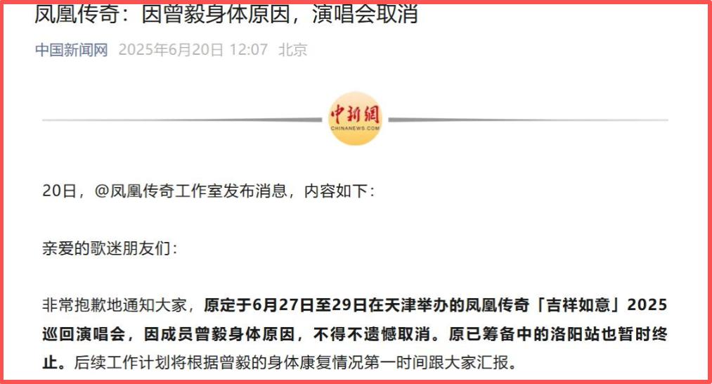 最终,凤凰传奇原定的天津、洛阳、成都、沈阳四站巡回演唱会接连取消,官方给出的理由是“曾毅身体不适”。